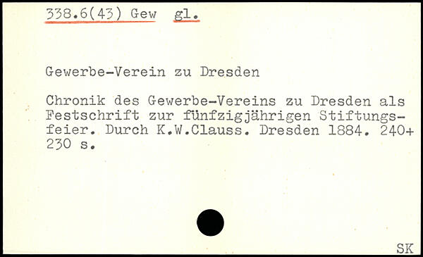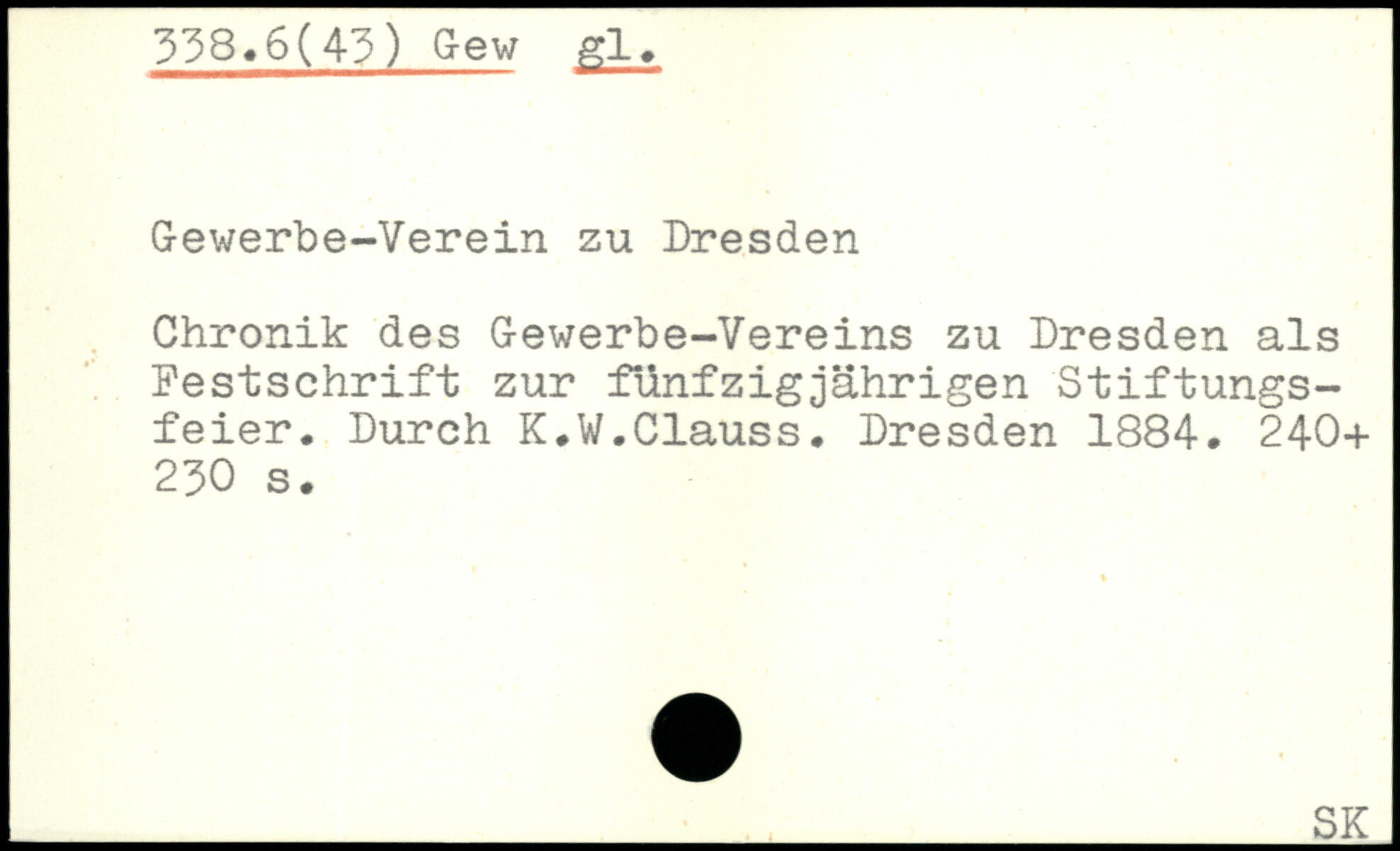 Gewerbe-Verein zu Dresden Chronik des Gewerbe-Vereins zu Dresden als Festschrift zur fünfzigjährigen Stiftungsfeier. Durch K.W.Clauss. Dresden 1884. 240+