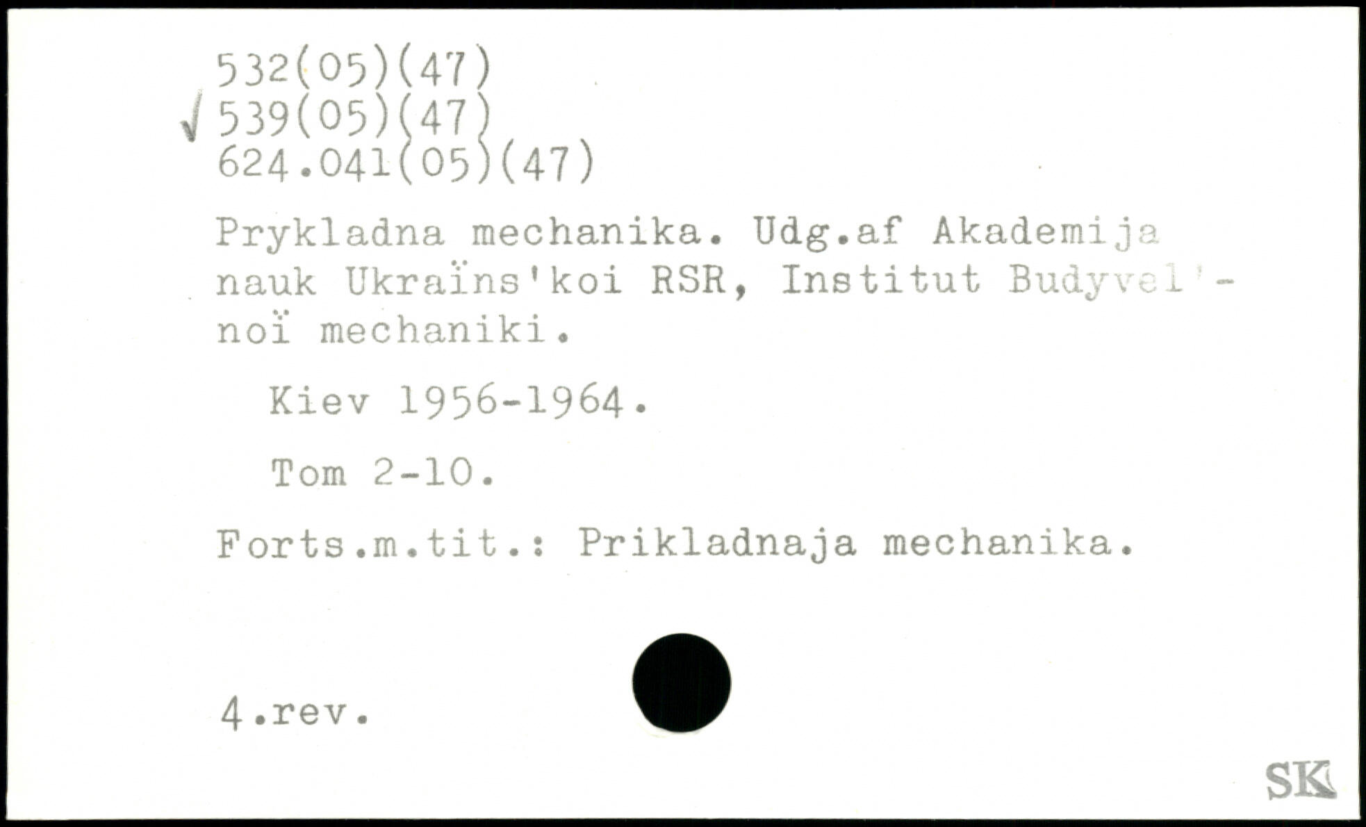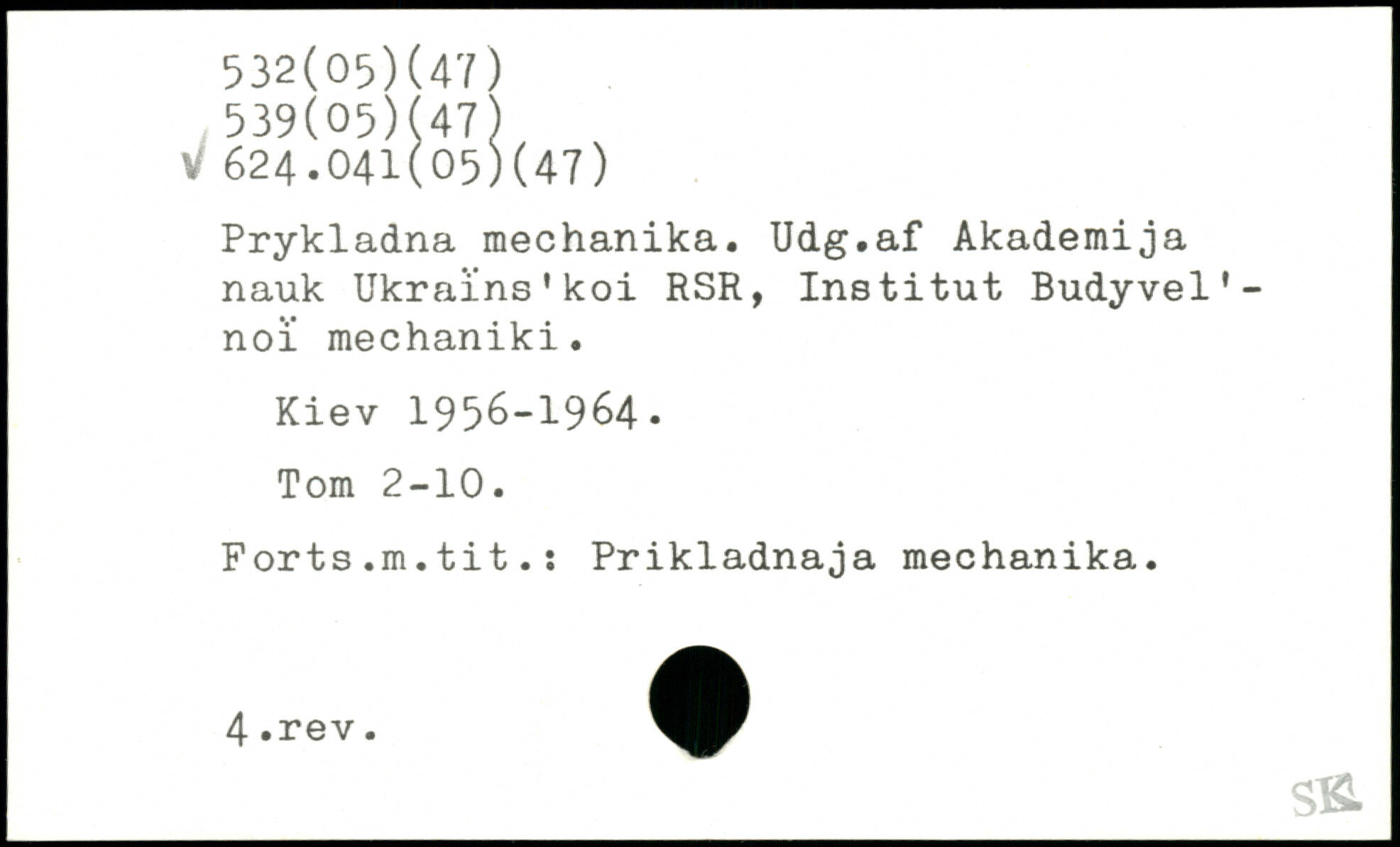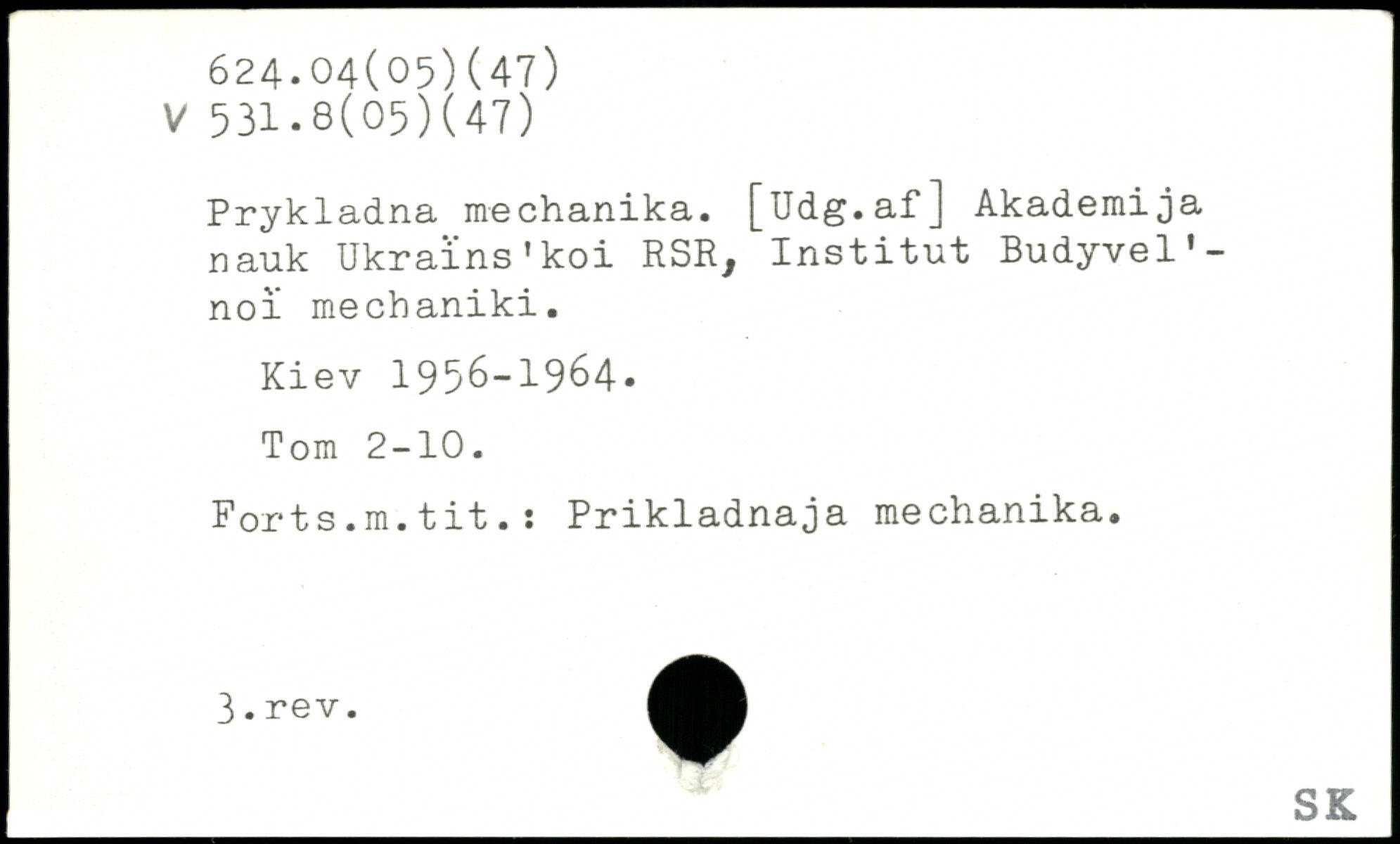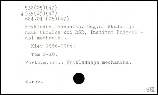 Prykladna mechanika. [Udg.af] Akademi ja nauk Ukraïns'koi RSR, Institut Budyvel'-noi mechaniki. Kiev 1956-1964. Tom 2-10. Forts.m.tit.: Prikladnaja mechanika.