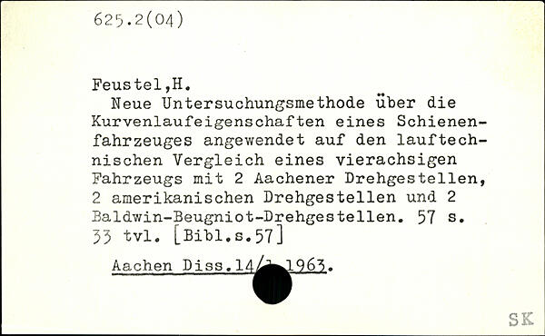Neue Untersuchungsmethode über die Kurvenlaufeigenschaften eines Schienenfahrzeuges angewendet auf den lauftechnischen Vergleich eines vierachsigen Fahrzeugs mit 2 Aachener Drehgestellen, 2 amerikanischen Drehgestellen und 2 Baldwin-Beugniot-Drehgestellen.