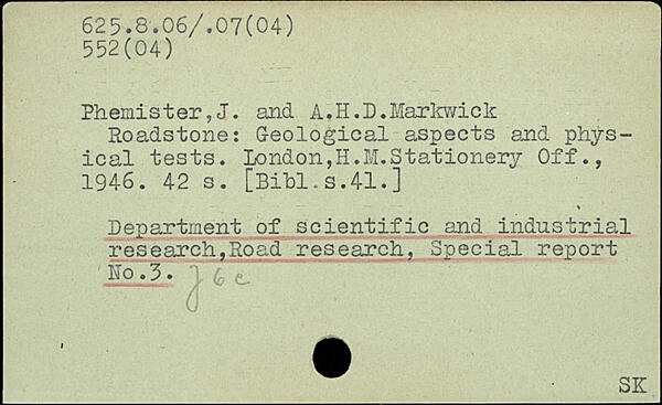 Phemister,J. and A.II.D.Markwick Roadstone: G-eological aspects and physical tests. London,H.M.Stationery Off., 194-6.