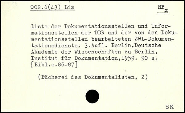 Liste der 'Dokumentationsstellen und Informationsstellen der DDR und der von den Dokumentationsstellen bearbeiteten ZWL-Dokumen-tationsdienste.