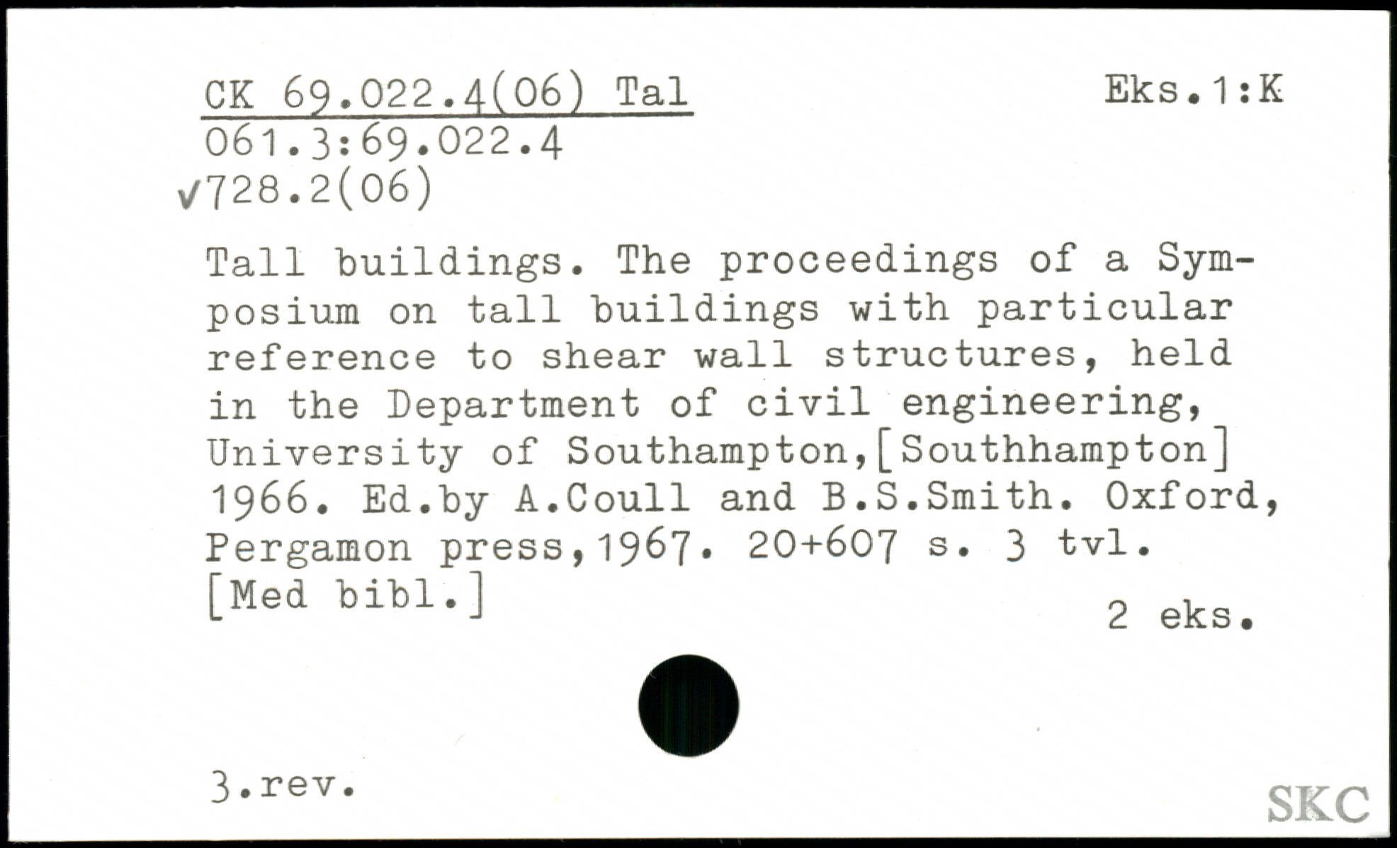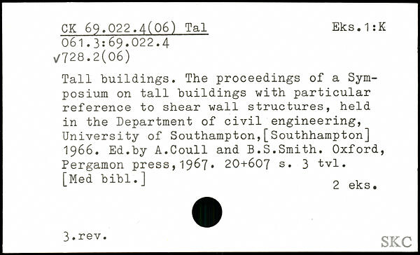 Tall buildings. The proceedings of a Symposium on tall buildings with particular reference to shear wall structures, held in the Department of civil engineering, University of Southampton,[Southhampton] 1966. Ed.by A.Coull and B.S.Smith.
