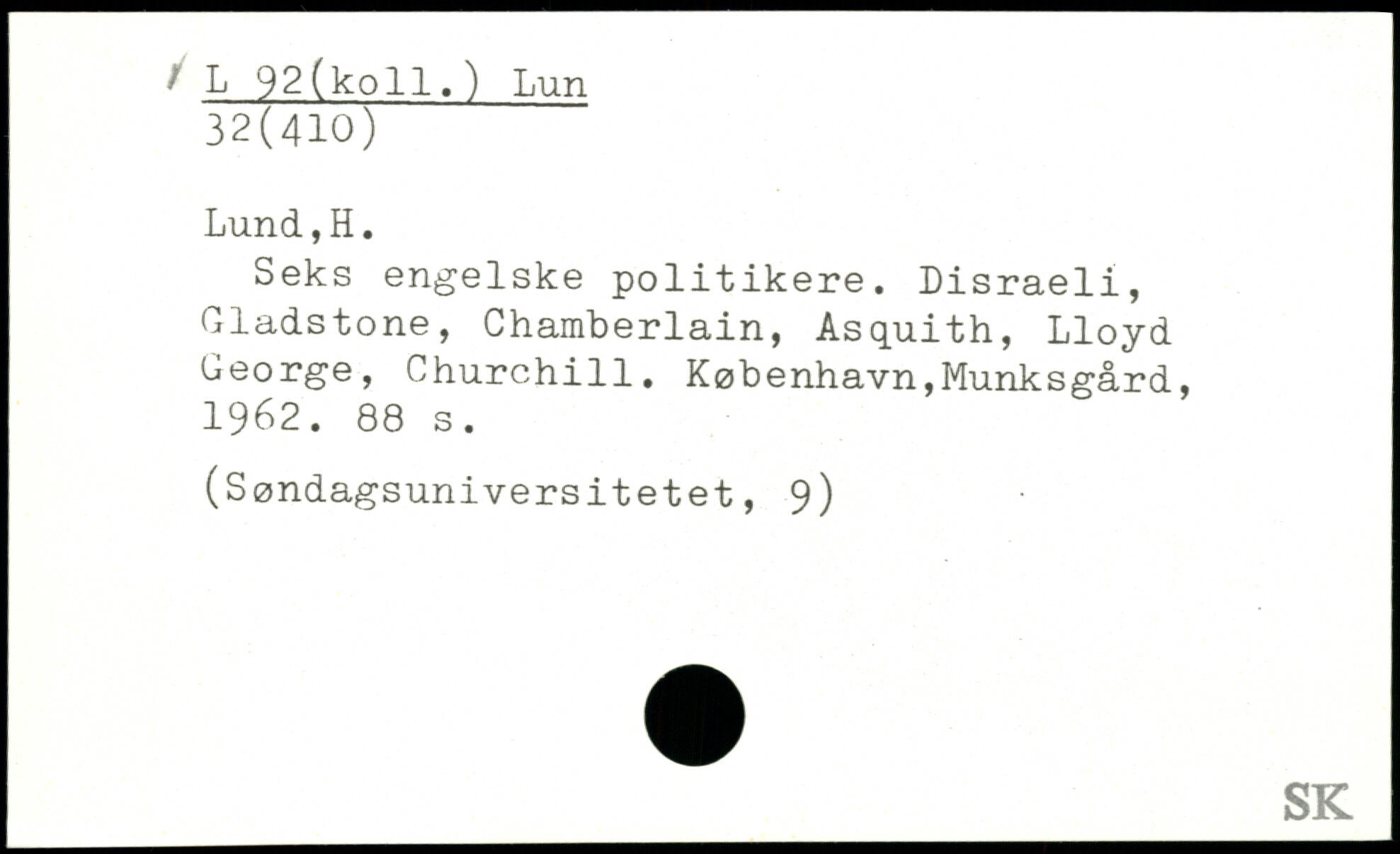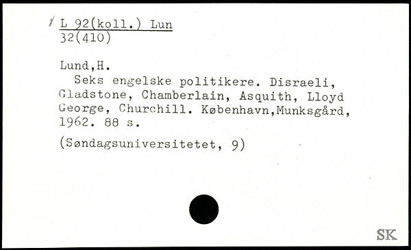 Seks engelske politikere. Disraeli, Gladstone, Chamberlain, Asquith, Lloyd George, Churchill.