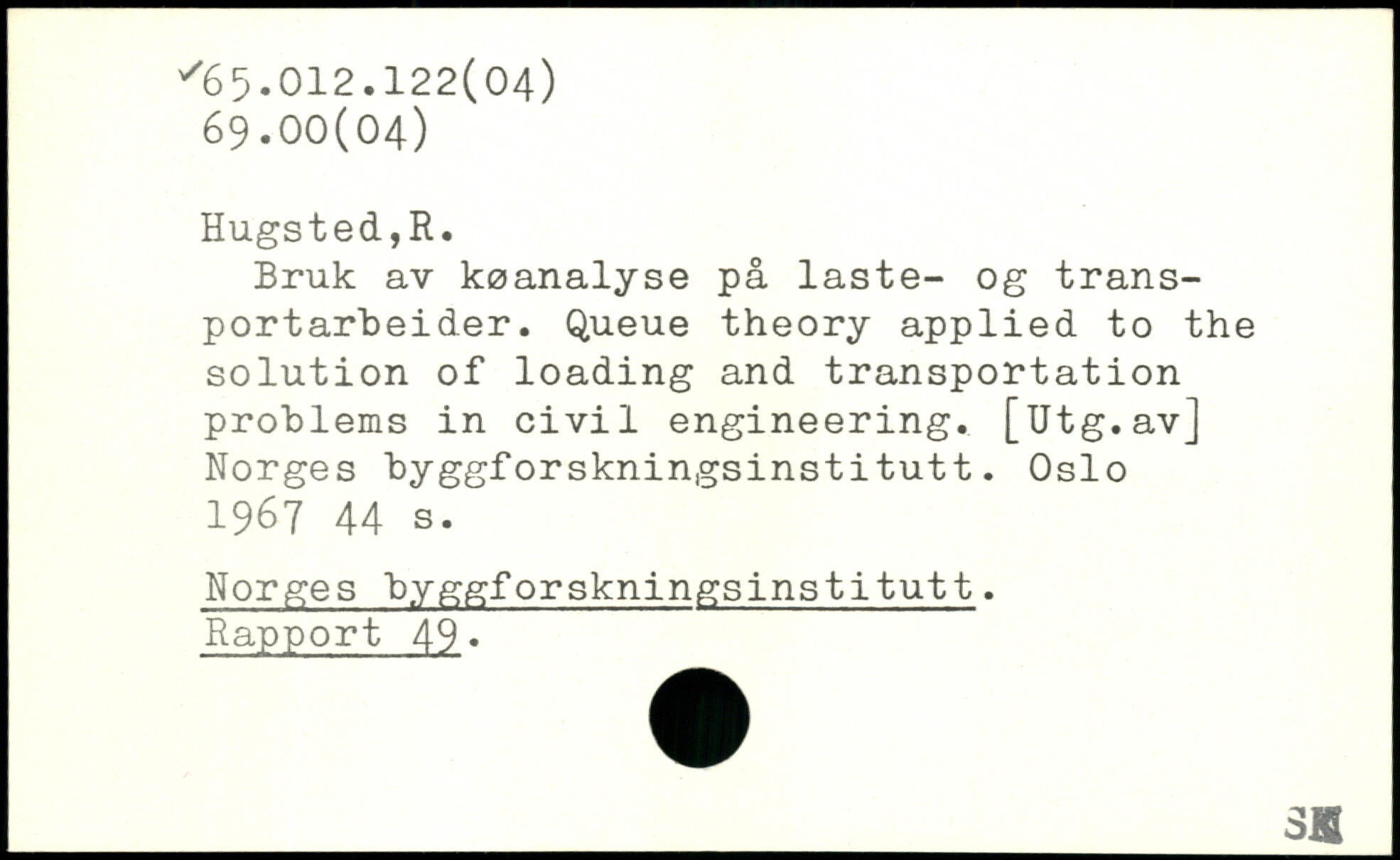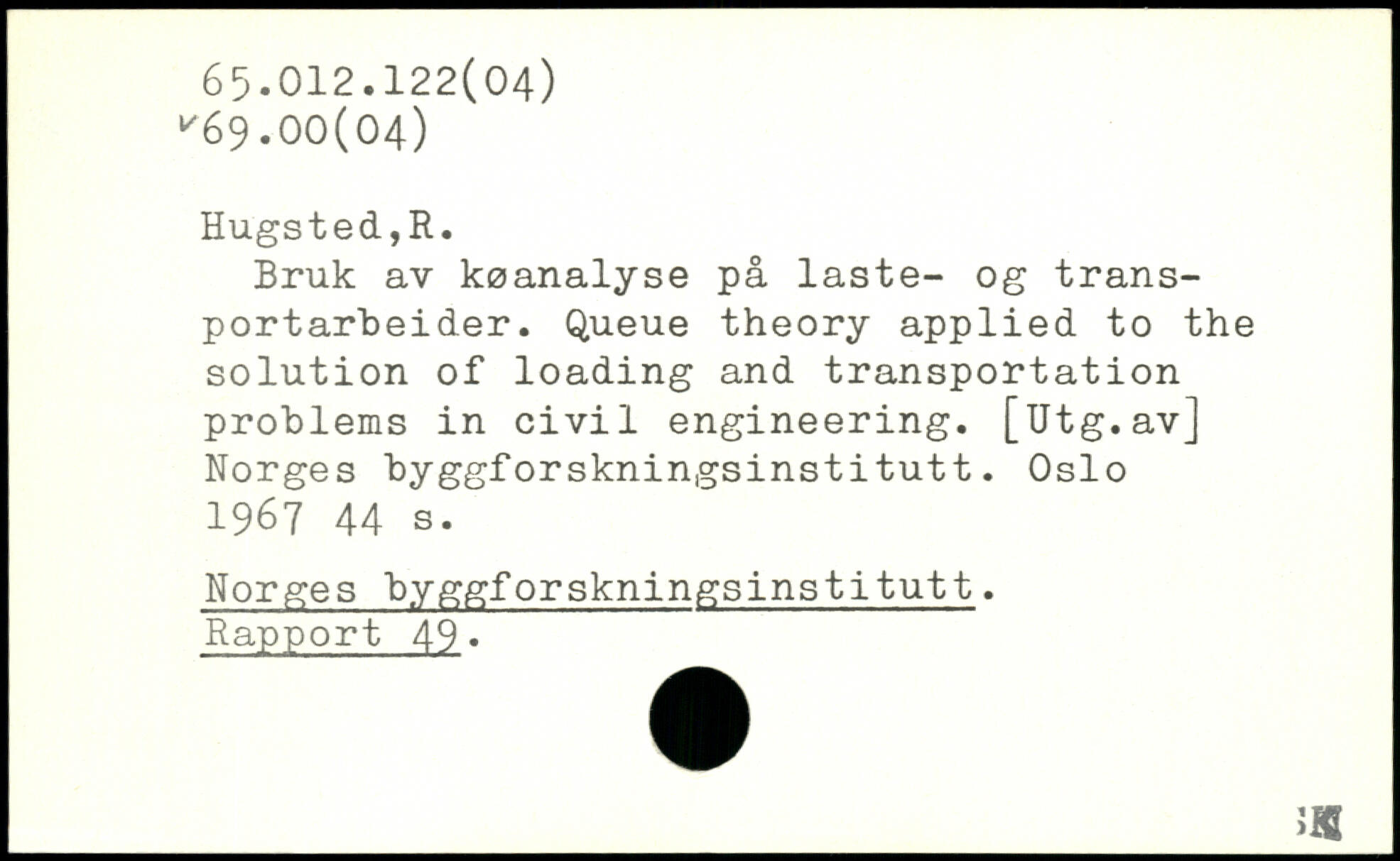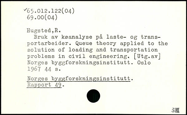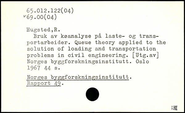 Bruk av koanalyse pa laste- og trans-portarbeider. Queue theory applied to the solution of loading and transportation problems in civil engineering. [Utg.av] Norges byggforskningsinstitutt. Oslo 1967