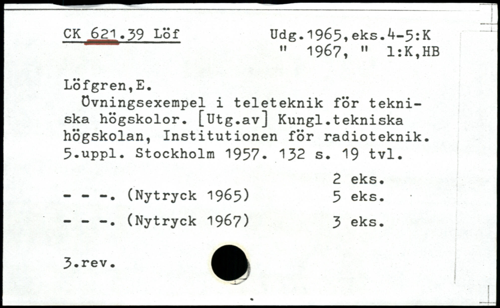 " 1967, " 1:K,HB Löfgren,E. övningsexempel i teleteknik för tekniska högskolor, [ütg.av] Kungl.tekniska högskolan, Institutionen för radioteknik. 5-uppl.