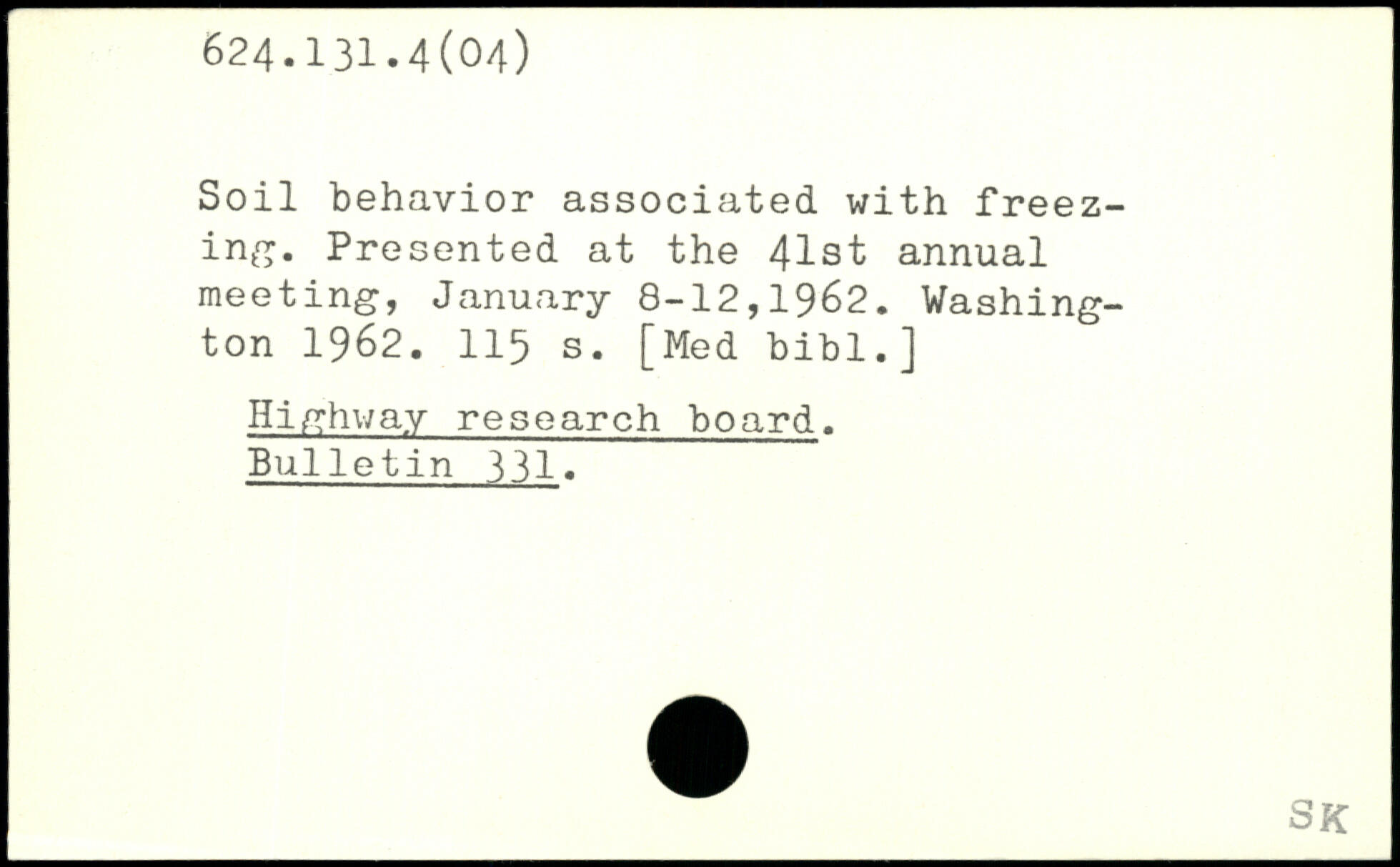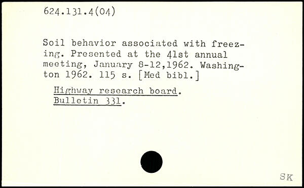 Soil behavior associated with freezing. Presented at the 41st annual meeting, January 8-12,1962.