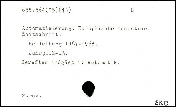 Automatisierung. Europäische Industrie-Zeitschrif t. Heidelberg 1967-1968. Jahrg.12-13. Herefter indgået i: Automatik.