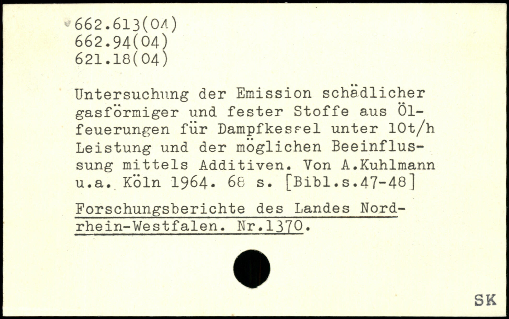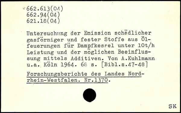Untersuchung der Emission schädlicher gasformiger und fester Stoffe aus Ölfeuerungen für Dampfkessel unter lOt/h Leistung und der möglichen Beeinflussung mittels Additiven. Von A.Kuhlmann u.a.
