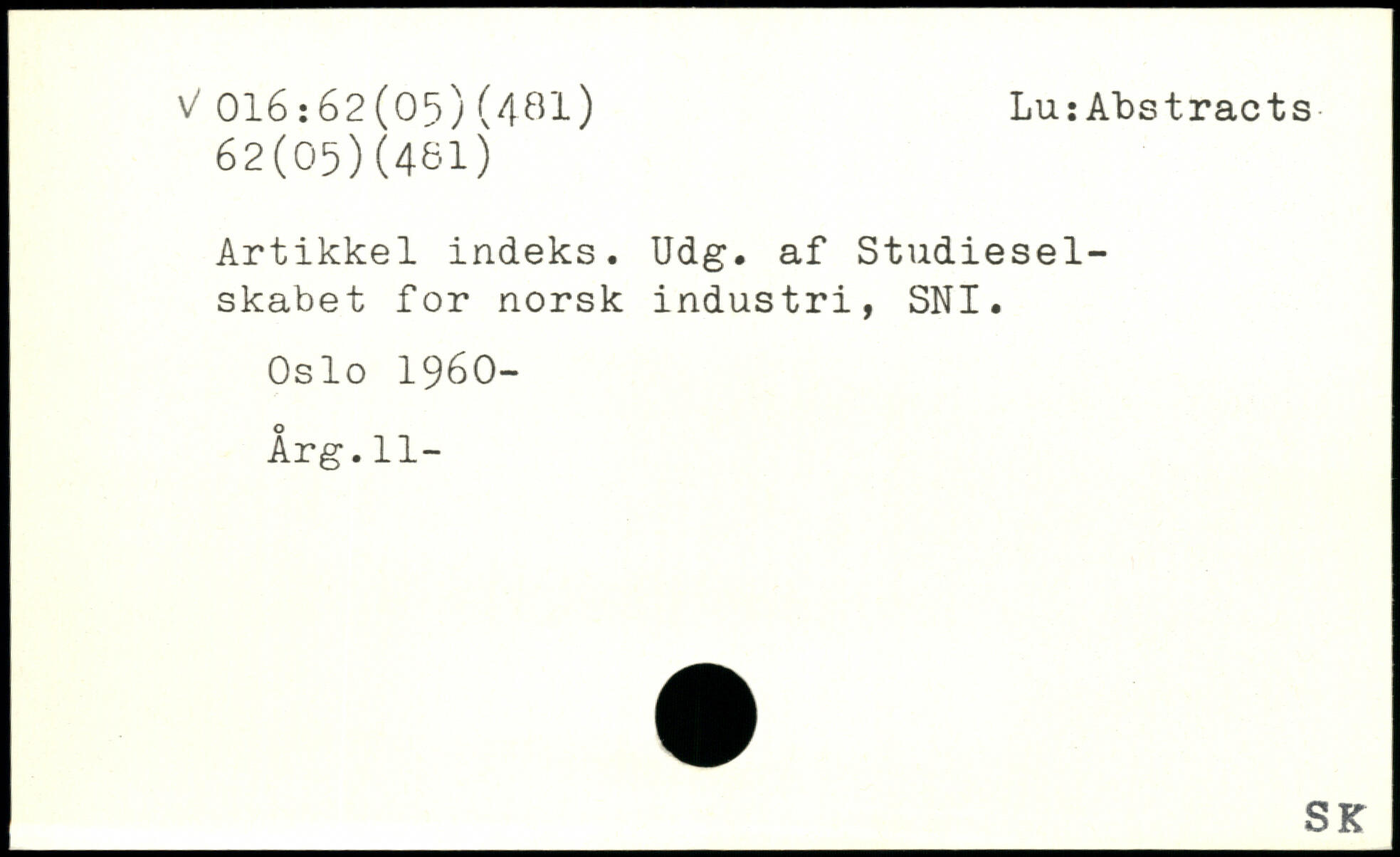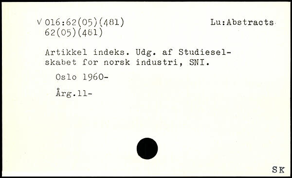 Artikkel indeks. Udg. af Studieselskabet for norsk industri, SNI. Oslo 1960- Årg.11-