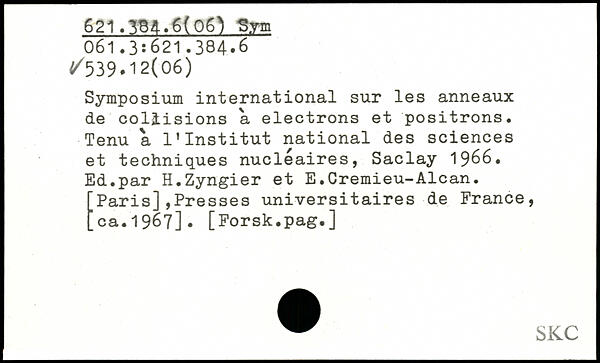 Symposium international sur les anneaux de collisions a électrons et positrons. Tenu a l’Institut national des sciences et techniques nucléaires, Saclay 1966. Ed.par H.Zyngier et E.Cremieu-Alcan.