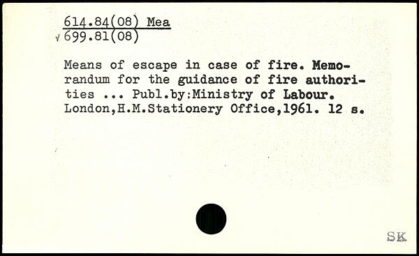 Means of escape in case of fire. Memorandum for the guidance of fire authorities ... Pub 1. "by: Minis try of Labour. London,H.M.Stationery Office,1961.