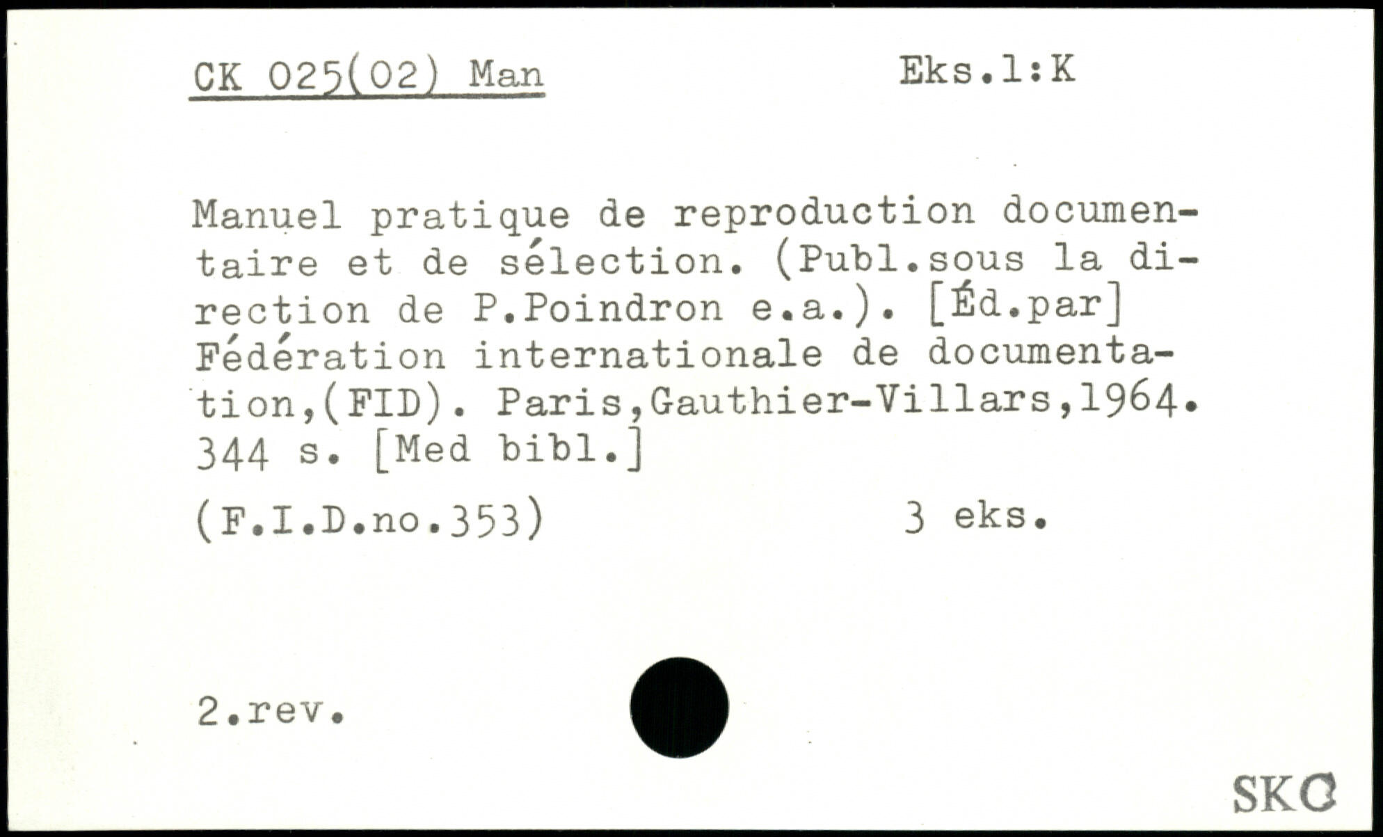 Manuel pratique de reproduction documentaire et de sélection. (Publ.sous la direction de P.Poindron e.a.). [Éd.par] Fédération internationale de documentation, (FID).