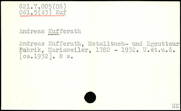 Andreas Kufferath, Metalltuch- und Egoutteur Fabrik, Mariaweiler, 1782 - 1932. U.st.u.ä. [ca.1932], 8 s.