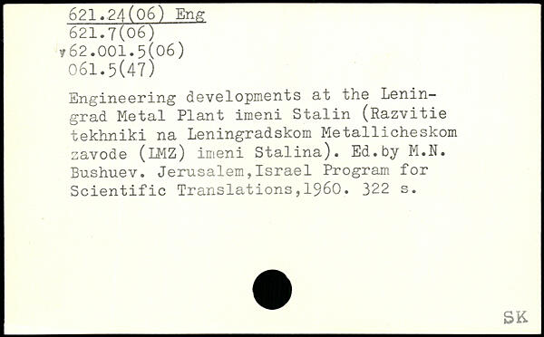 Engineering developments at the Leningrad Metal Plant imeni Stalin (Razvitie tekhniki na Leningradskom Metallicheskom zavode (IMZ) imeni Stalina). Ed.by M.N. Bushuev. Jerusalem,Israel Program for Scientific Translations,1960.