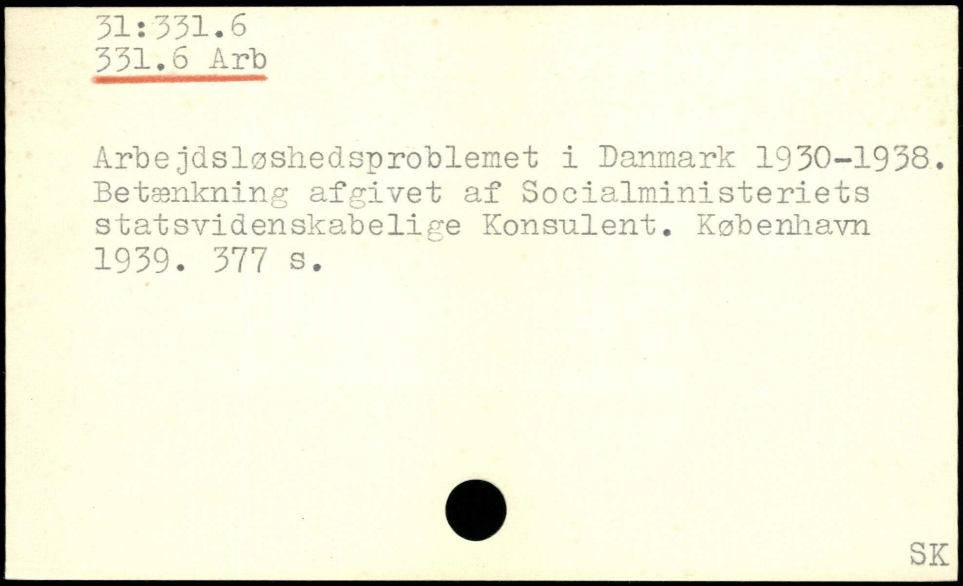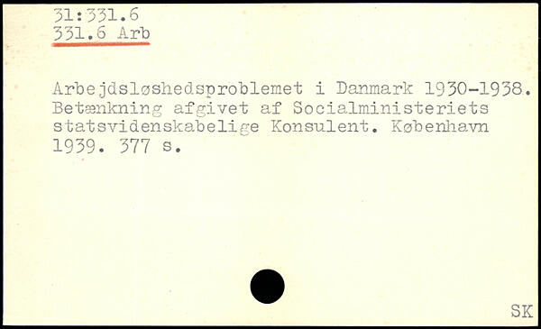 Arbejdsløshedsproblemet i Danmark 1930-1938. Betænkning afgivet af Socialministeriets s t at svi den skabe li pe Konsulent.