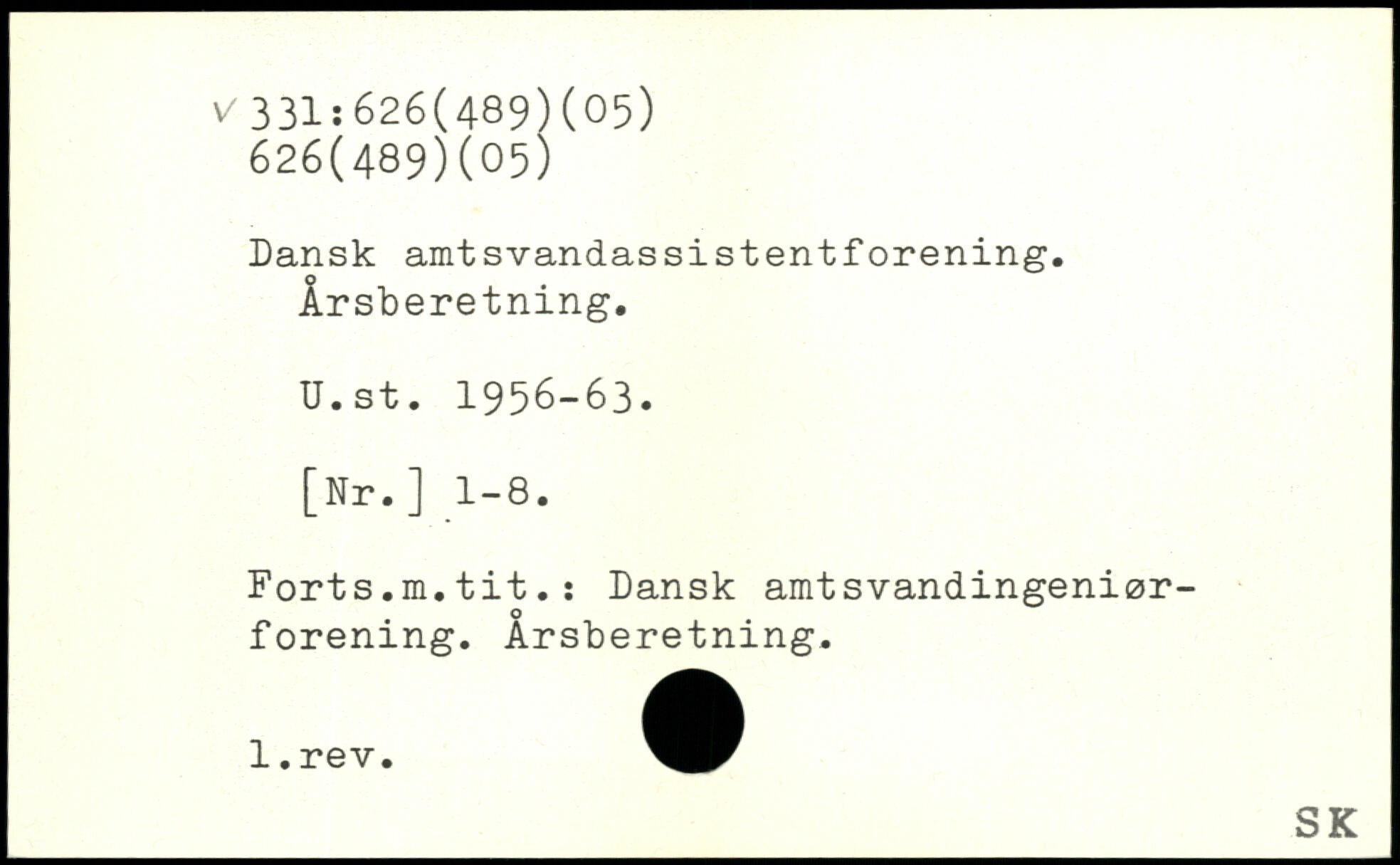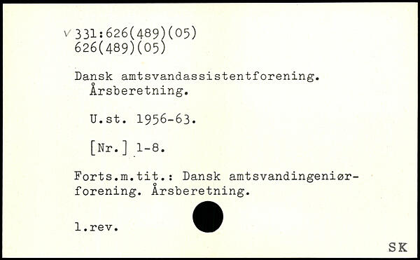Dansk amtsvandassistentforening. Årsberetning. U.st. 1956-63. [Nr.] 1-8. Forts.m.tit.i Dansk amtsvandingeniørforening. Årsberetning.