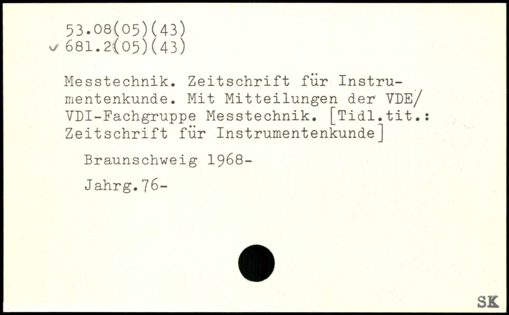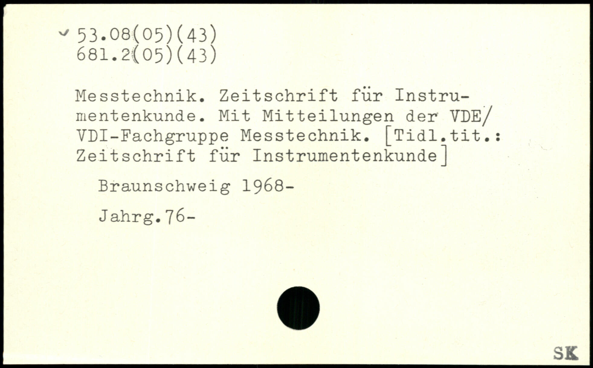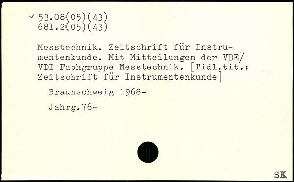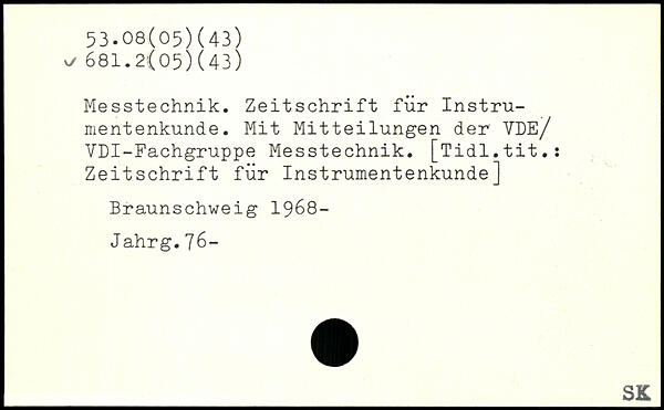 Messtechnik. Zeitschrift für Instrument enkunde. Mit Mitteilungen der VDE/ VDI-Fachgruppe Messtechnik. [Tidl.tit.: Zeitschrift für Instrumentenkunde] Braunschweig 1968- Jahrg.76-