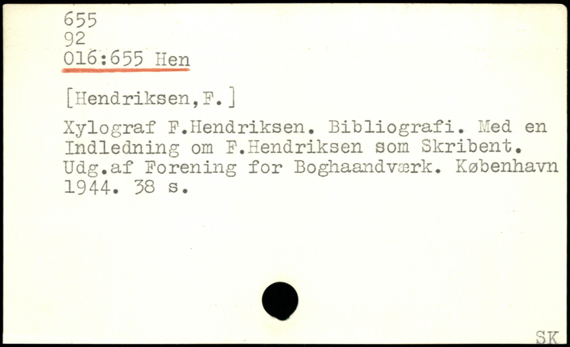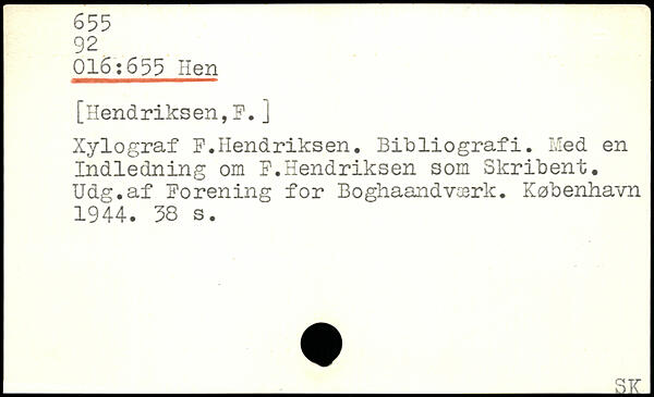 016:699 Hen [Hendriksen,F.j Xylograf F.IIendriksen. Bibliografi. Med en Indledning om P.Hendriksen 3om Skribent. Udg.af forening for Boghaandværk.