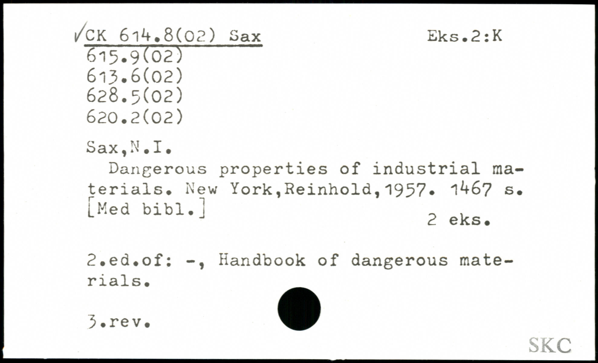Dangerous properties of industrial materials. New York.Reinhold,1957. 1^