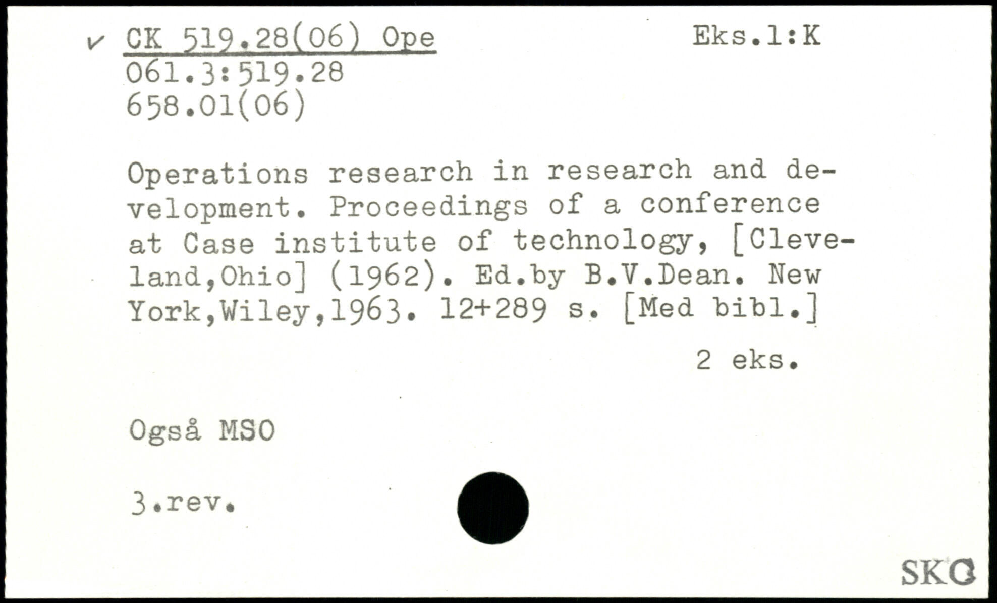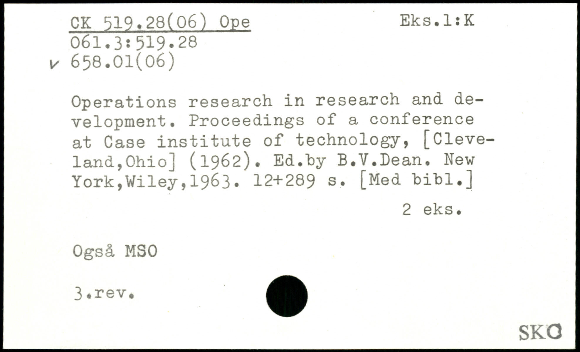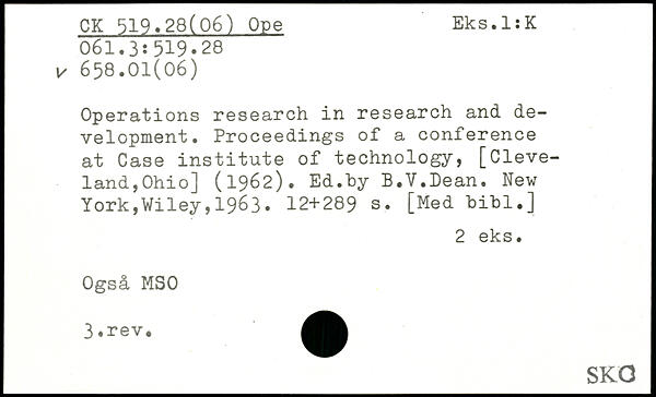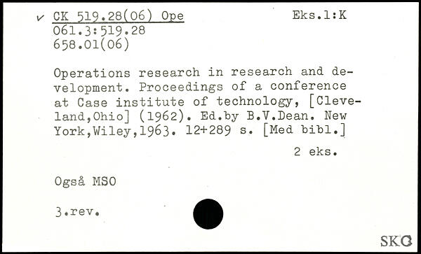 Operations research in research and development. Proceedings of a conference at Case institute of technology, [Cleveland,Ohio] (1962). Ed.hy B.V.Dean.