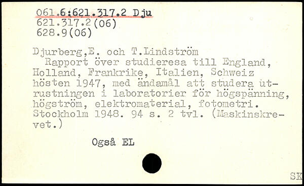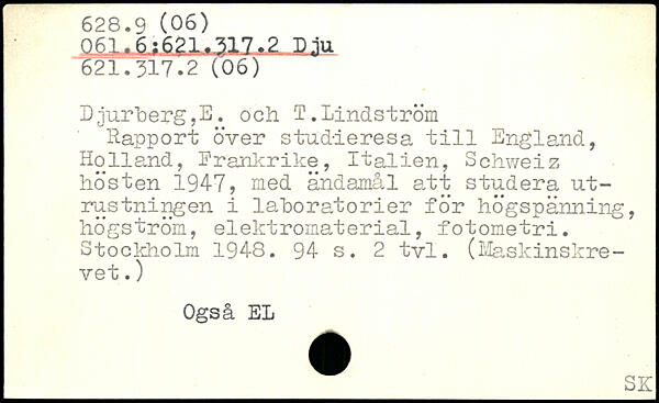 Happort över studieresa till England, Holland, Frankrike, Italien, Schweiz hösten 1947, med ändamål att studera utrustningen i laboratorier för högspänning, högström, elektromaterial, fotometri.
