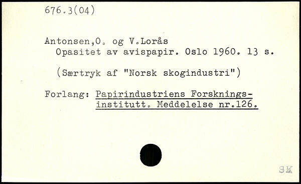 Antonsen?0o og V,Lorås Opasitet av avispapir. Oslo 1960.