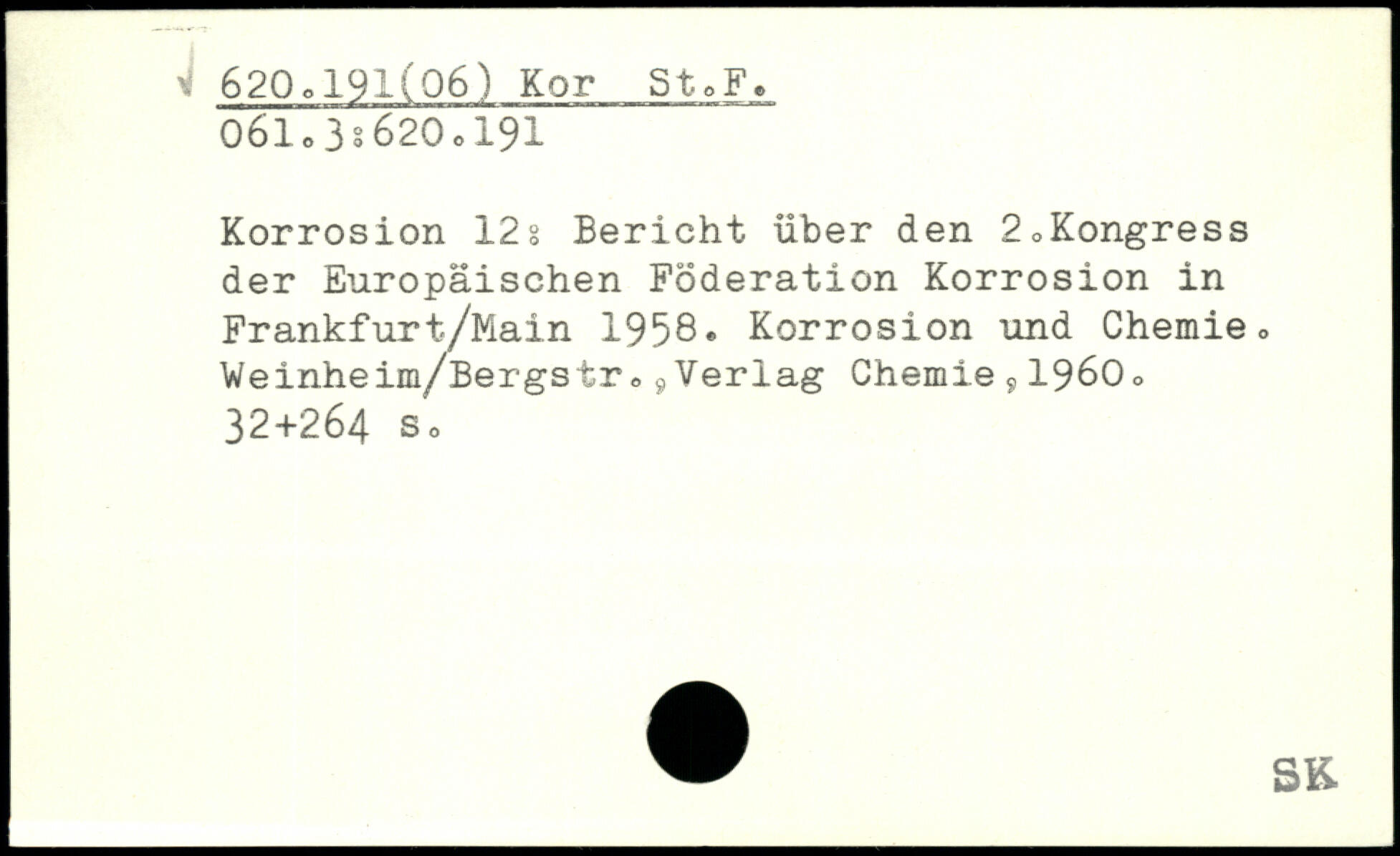 Korrosion 12s Bericht über den 2.Kongress der Europäischen Föderation Korrosion in Frankfurt/Main 1958. Korrosion und Chemie. Weinheim/Bergstr.9Verlag Chemie,1960.