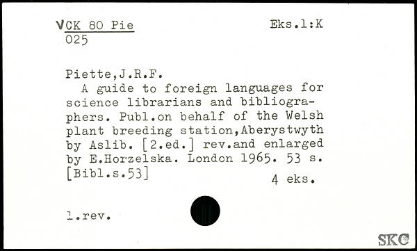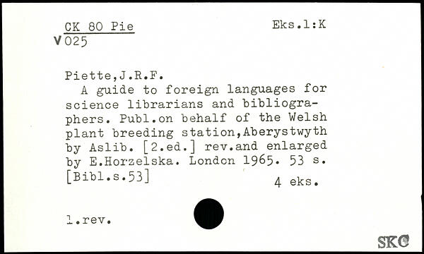 A guide to foreign languages for science librarians and bibliographers. Publ.on behalf of the Welsh plant breeding station,Aberystwyth by Aslib.