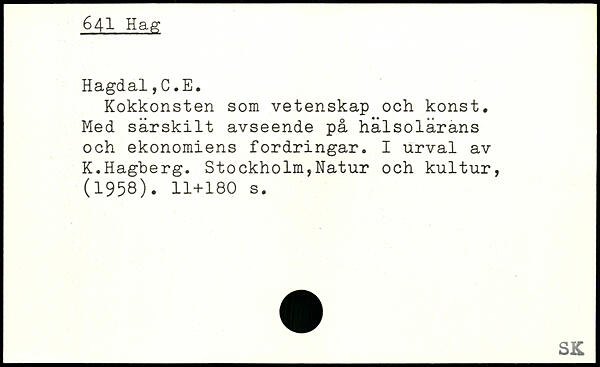 Kokkonsten som vetenskap och konst. Med särskilt avseende på hälsolärans och ekonomiens fordringar. I urval av K.Hagberg. Stockholm,Natur och kultur, (1958).