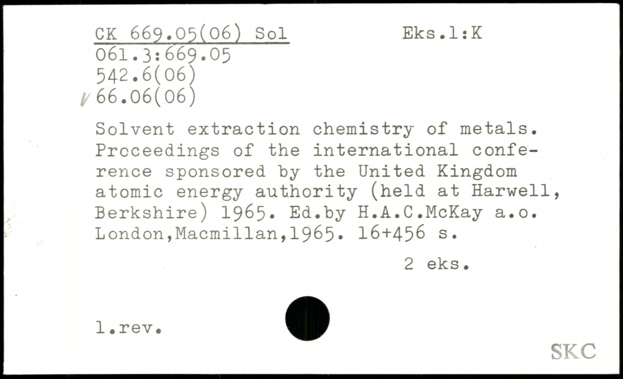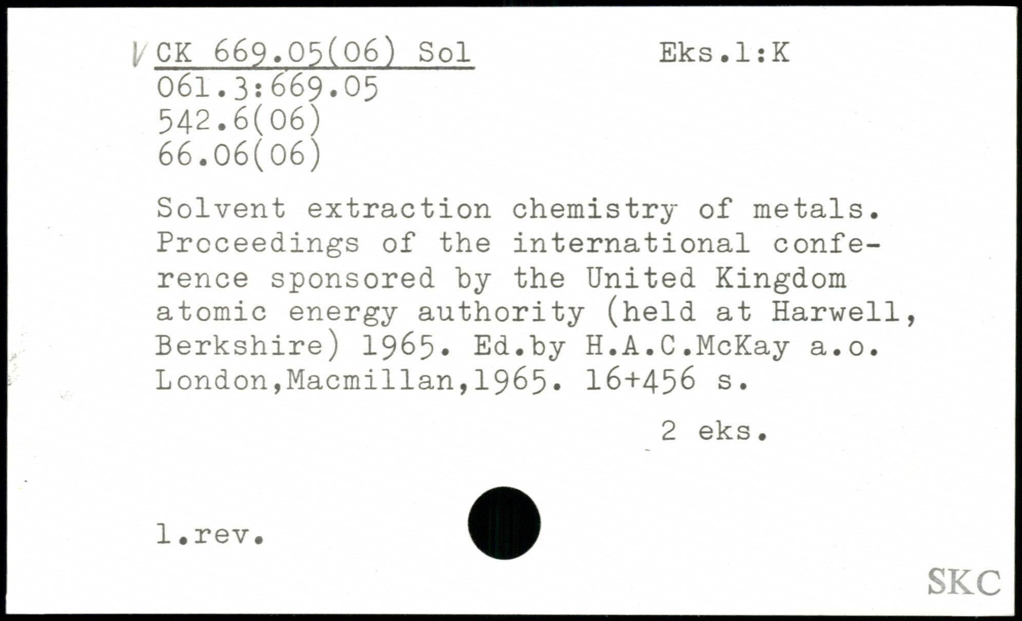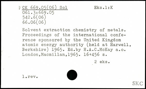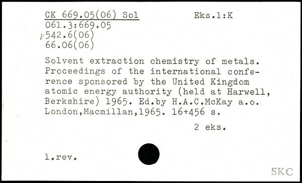 Solvent extraction chemistry of metals. Proceedings of the international conference sponsored by the United Kingdom atomic energy authority (held at Harwell, Berkshire) 1965, Ed.by H.A.C.McKay a.o.