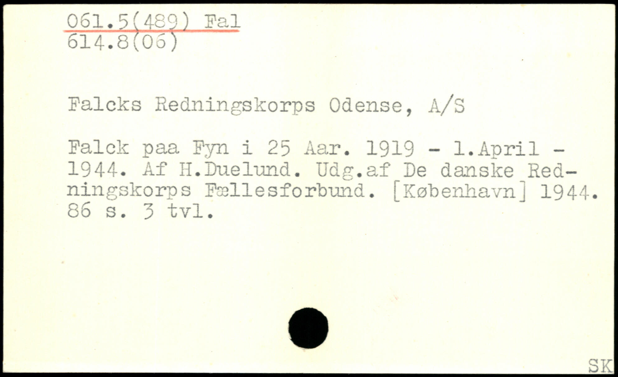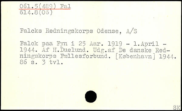 Falcks Redningskorps Odense, å/S Falck paa Fyn i 25 Aar. 1919 - 1.April -1944. Af H.Duelund. Udg.af De danske^Redningskorps Fællesforbund.