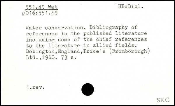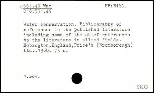 Water conservation. Bibliography of references in the published literature including some of the chief references to the literature in allied fields. Bebington,England,Price’s (Bromborough) Ltd.,1960.
