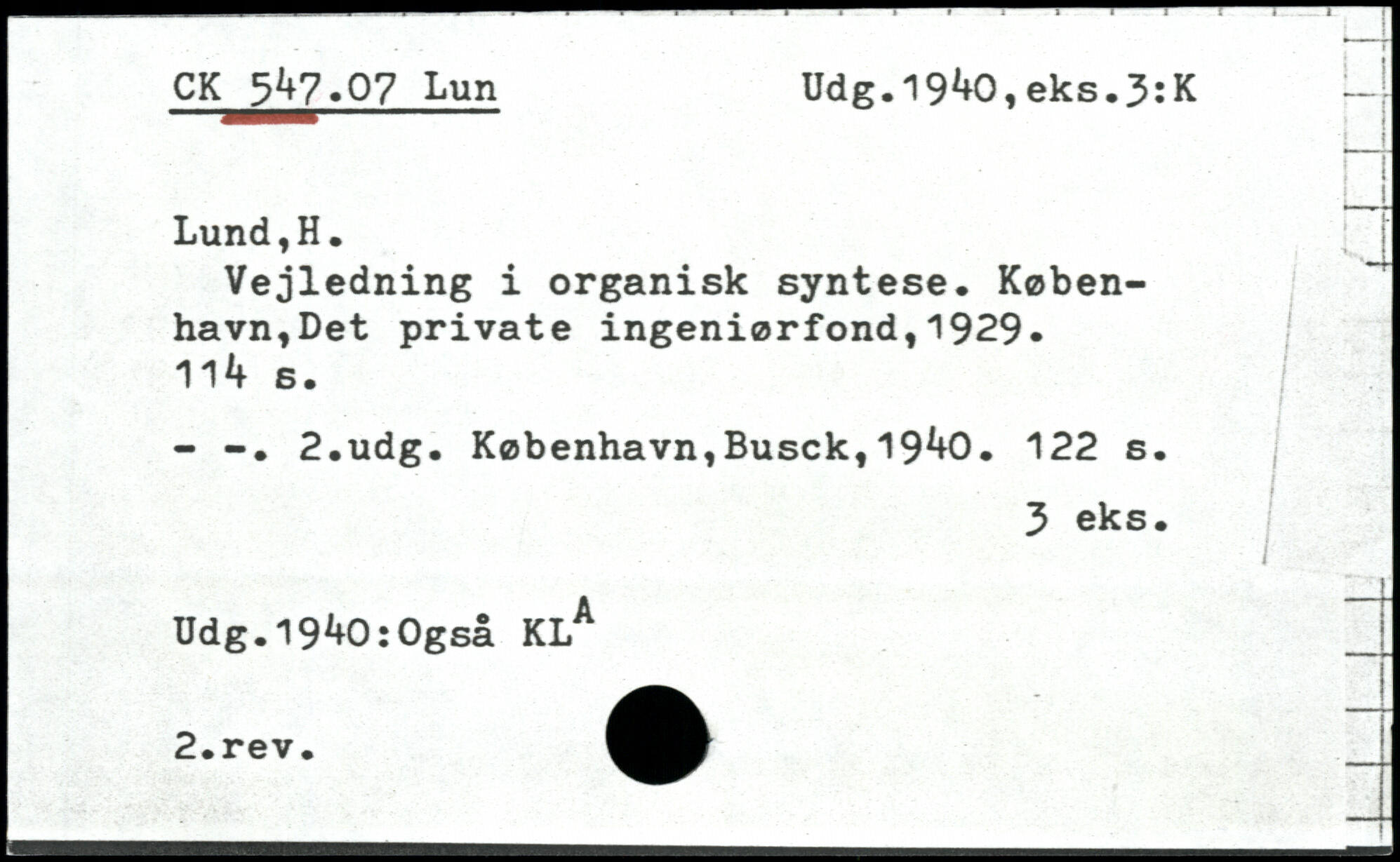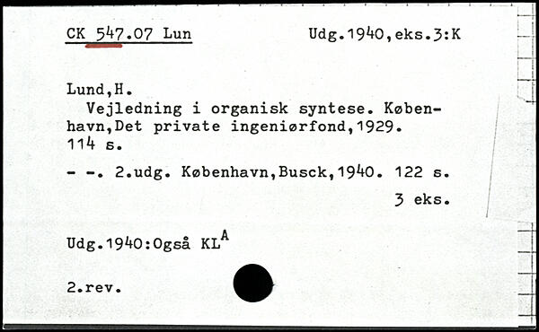 Vejledning i organisk syntese, København,Det private ingeniørfond,1929, 1114 s. - 2.udg. København,Busck,19^0. 122 s.