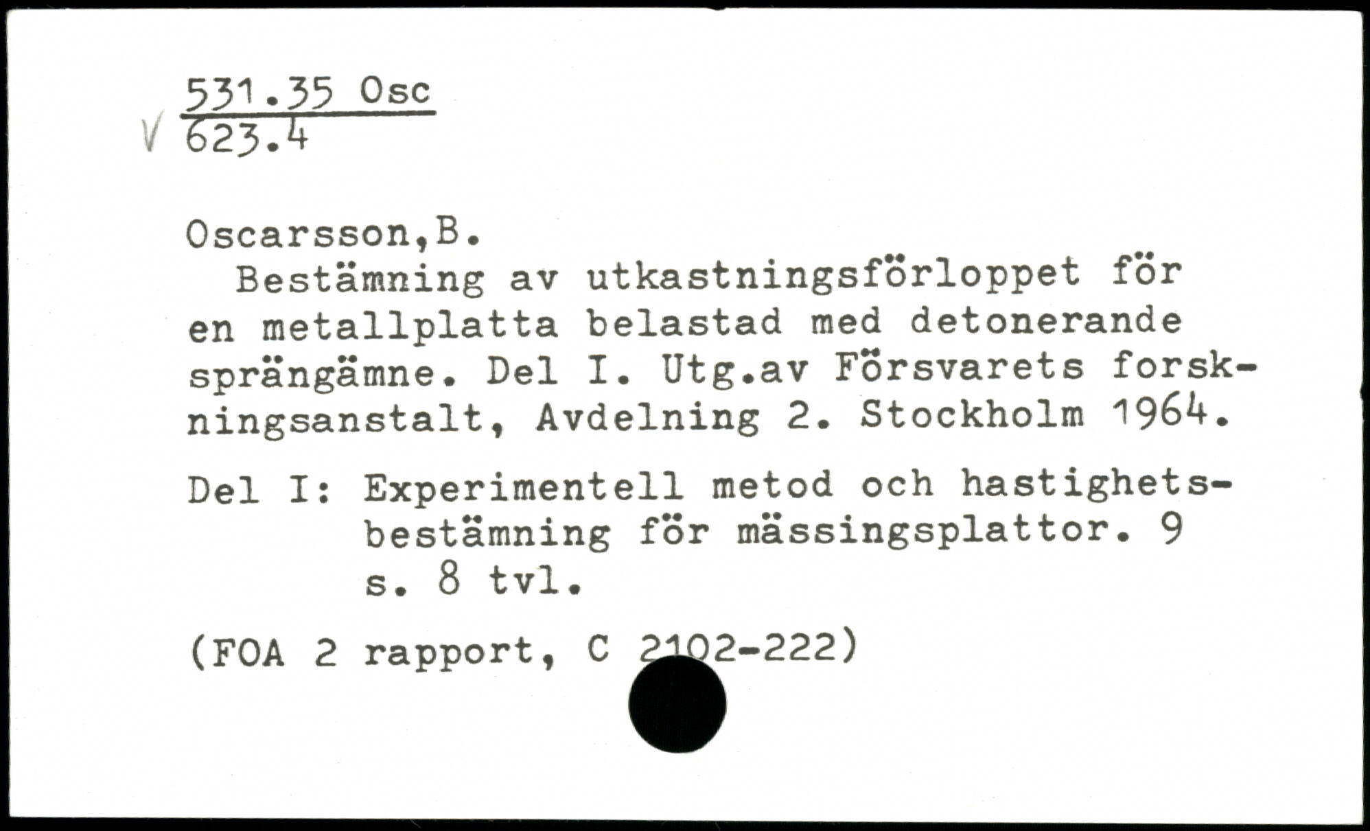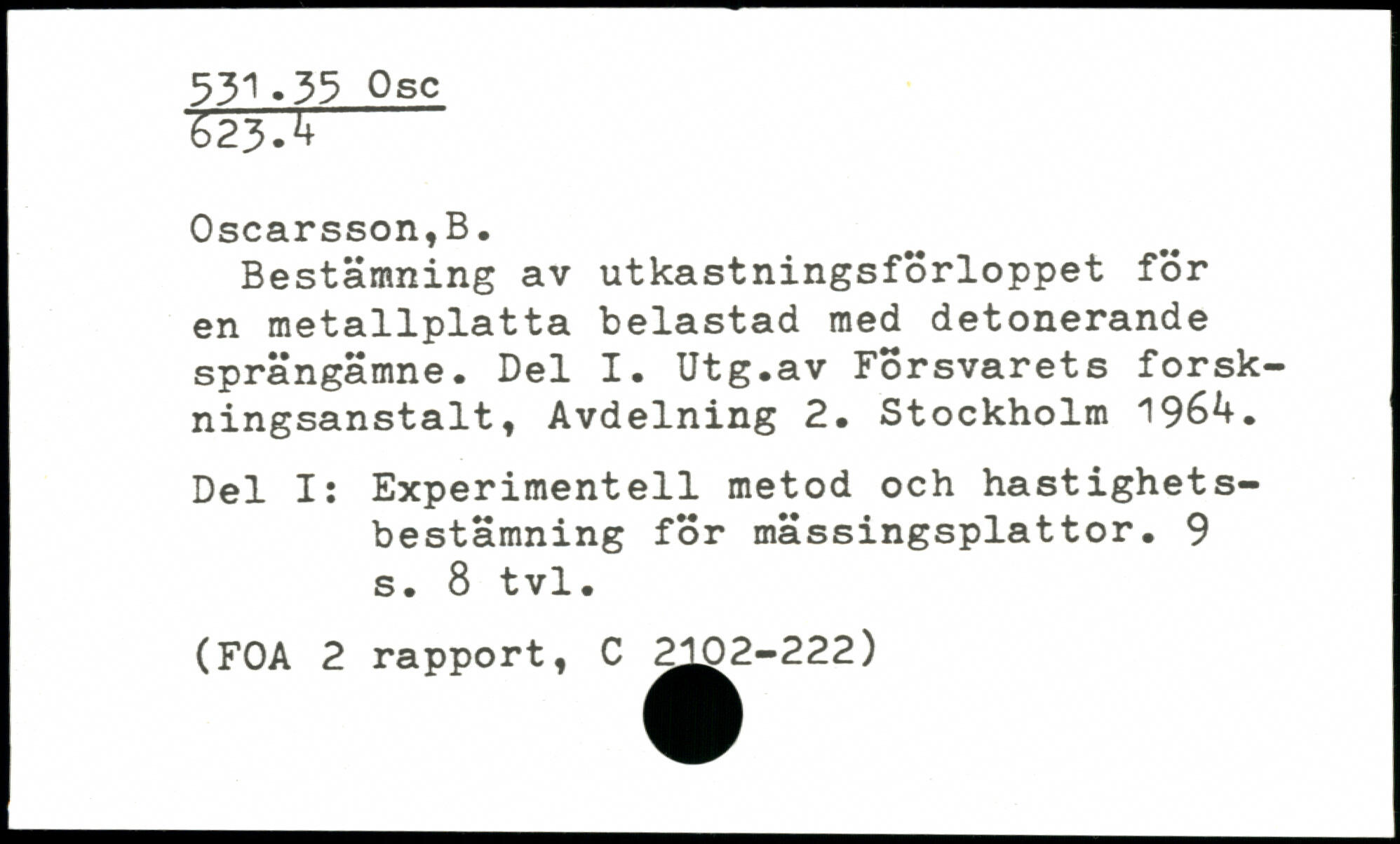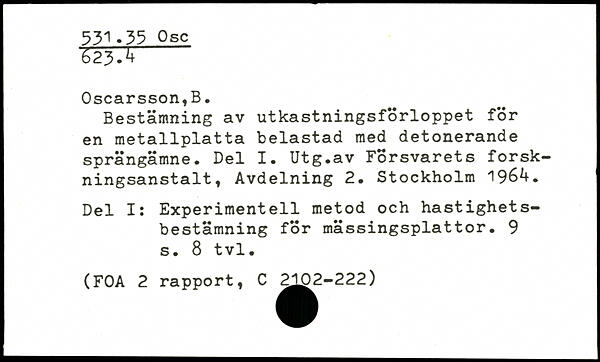 Bestämning av utkastningsförloppet för en metallplatta belastad med detonerande sprängämne. Del I. Utg.av Försvarets forskningsanstalt , Avdelning 2.