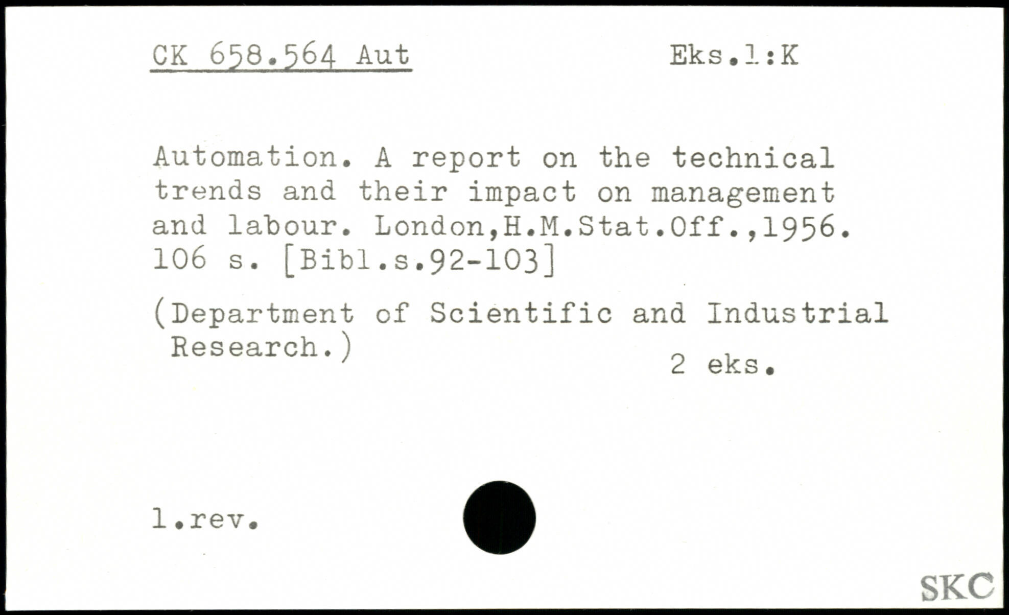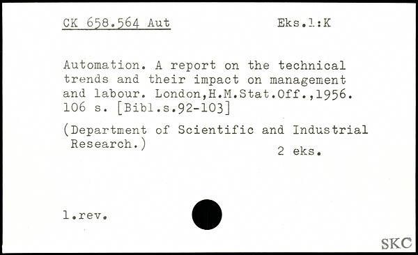 Automation. A report on the technical trends and their impact on management and labour. London,H.M.Stat.Off.,1956.