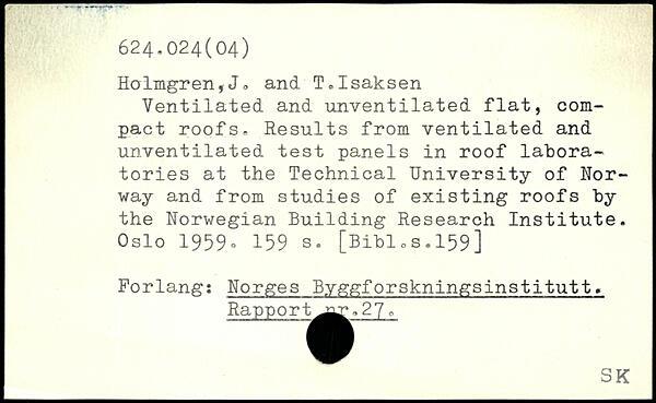 Ventilated and unventilated flat, compact roofs. Results from ventilated and unventilated test panels in roof laboratories at the Technical University of Norway and from studies of existing roofs by the Norwegian Building Research Institute. Oslo 1959