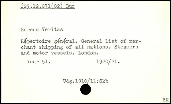 Repertoire general. General list of merchant shipping of all nations. Steamers and motor vessels. London. Year 51. 1920/21. Udg.1910/111Skb
