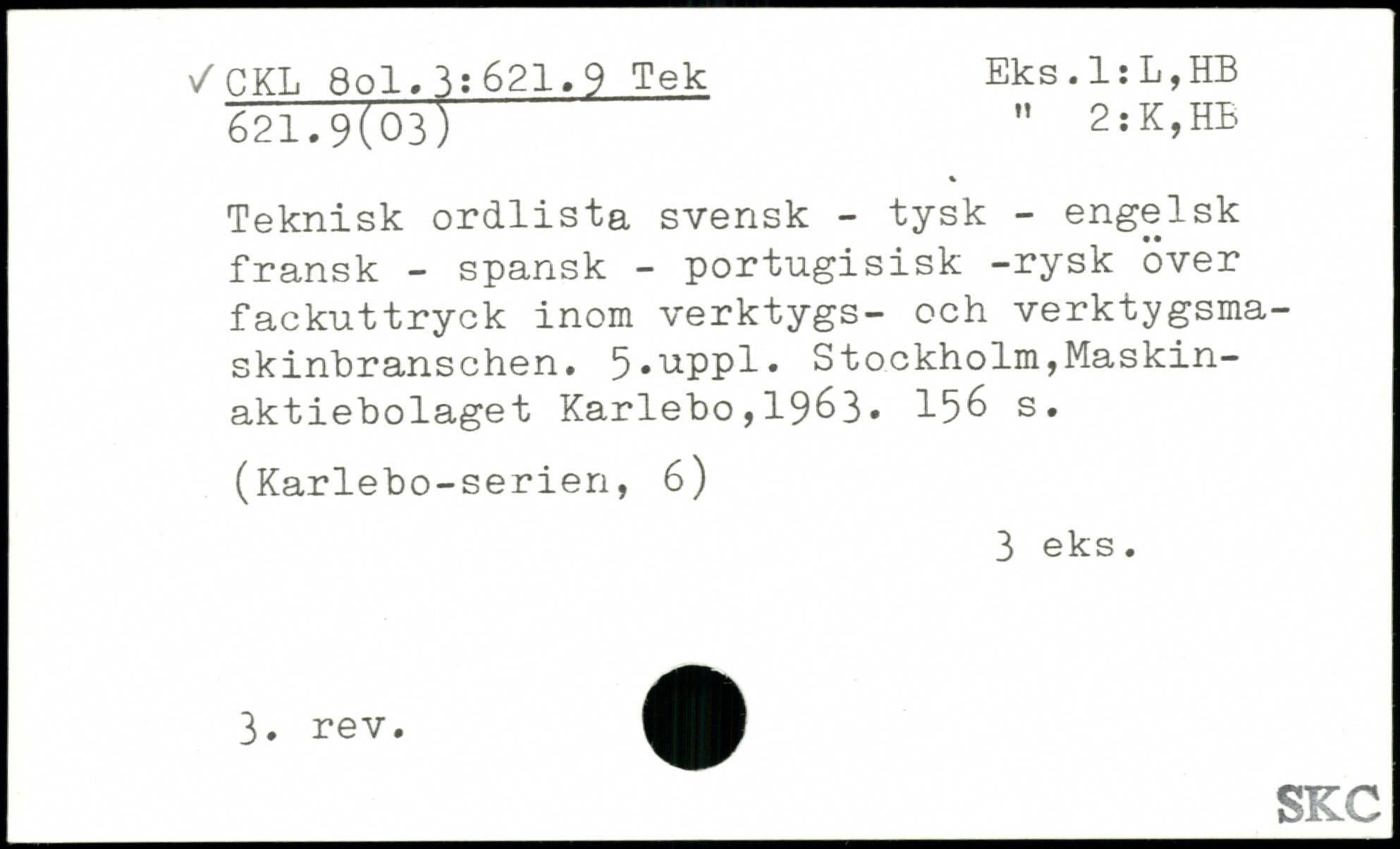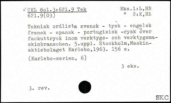 Teknisk ordlista svensk - tysk - engelsk fransk - spansk - portugisisk -rysk över fackuttryck inom verktygs- och verktygsmaskinbranschen. 5.uPPl.