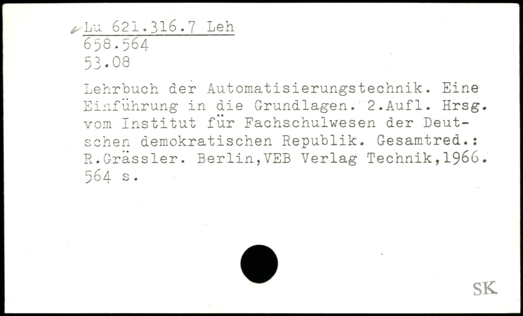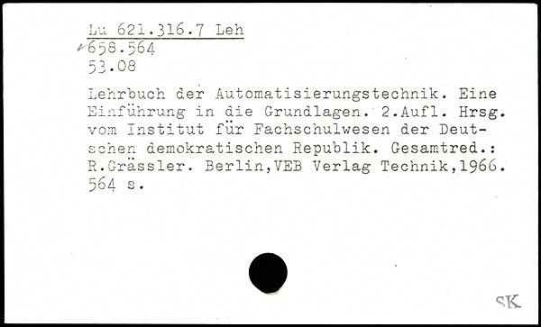 Lehrbuch der Automatisierungstechnik. Eine Einführung in die Grundlagen. 2-Aufl. Hrsg, vom Institut für Fachschulwesen der Deutschen demokratischen Republik. Gesamtred.: R.Grassier.