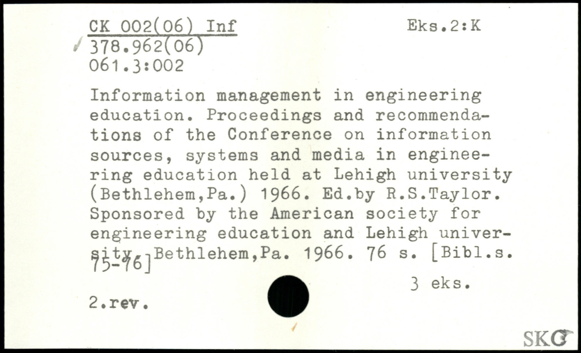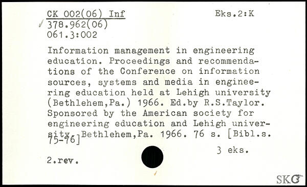 Information management in engineering education. Proceedings and recommendations of the Conference on information sources, systems and media in engineering education held at Lehigh university (Bethlehem,Pa.) 1966. Ed.by R.S.Taylor. Sponsored by the American society for engineering education and Lehigh univer-^jLt^gjBethlehem,Pa. 1966. 7& s.