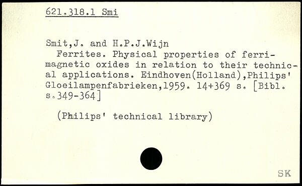 Smit,J, and H.P.J.Wijn Ferrites. Physical properties of ferri-magnetic oxides in relation to their technical applications. Eindhoven(Holland),Philips' Gloeilampenfahrieken,1959