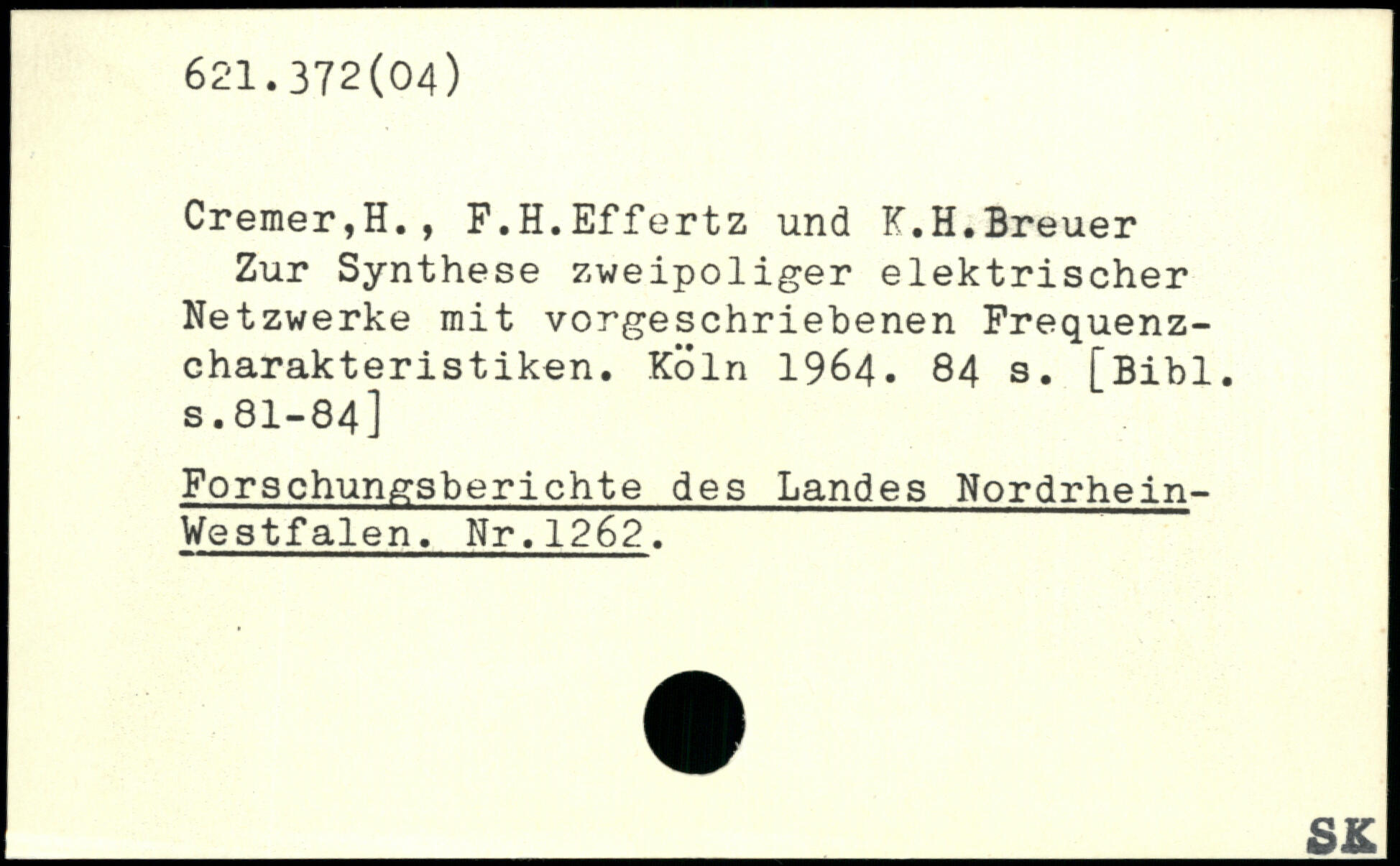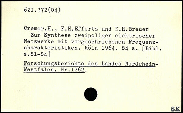 Cremer,H., F.H.Effertz und F.H.Breuer Zur Synthese zweipoliger elektrischer Netzwerke mit vorgeschriebenen Frequenzcharakteristiken.