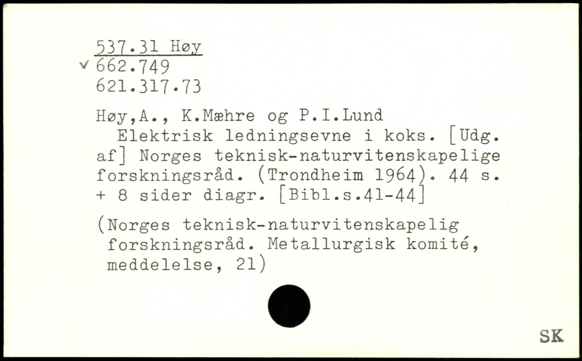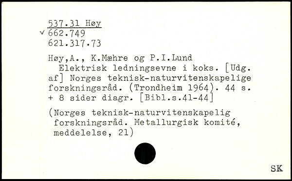 Elektrisk ledningsevne i koks. [Udg. af] Norges teknisk-naturvitenskapelige forskningsråd. (