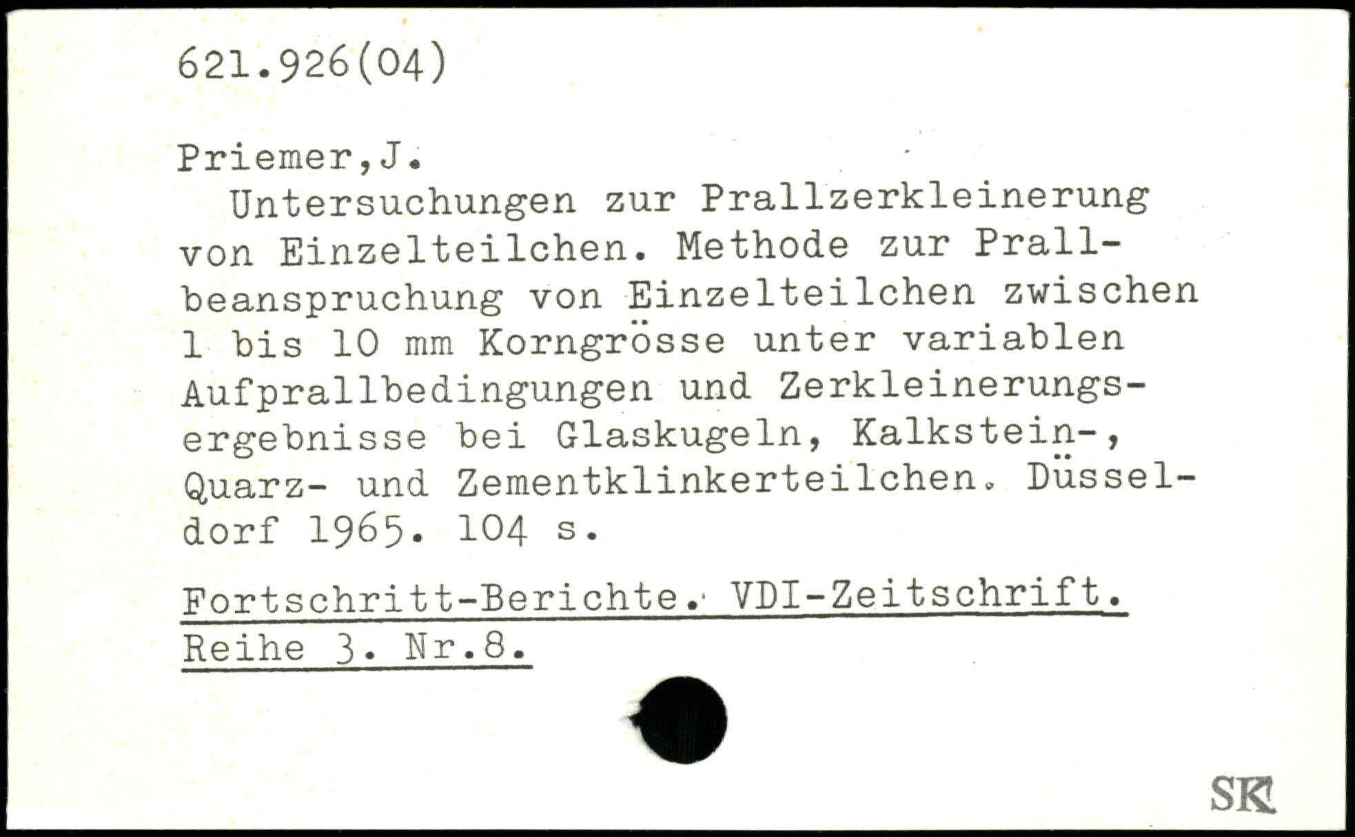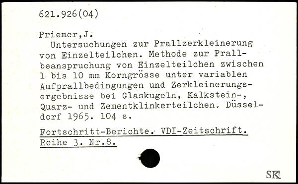 Untersuchungen zur Prallzerkleinerung von Einzelteilchen. Methode zur Prallbeanspruchung von Einzelteilchen zwischen 1 bis 10 mm Korngrösse unter variablen Aufprallbedingungen und Zerkleinerungsergebnisse bei Glaskugeln, Kalkstein-, Quarz- und Zementklinkerteilchen, Düsseldorf 1965.