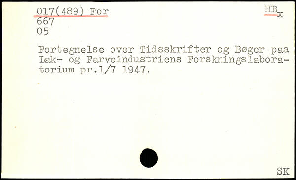 Fortegnelse over Tidsskrifter og Bøger paa Lak- og Farveindustriens Forskningslaboratorium pr.1/7 1947.