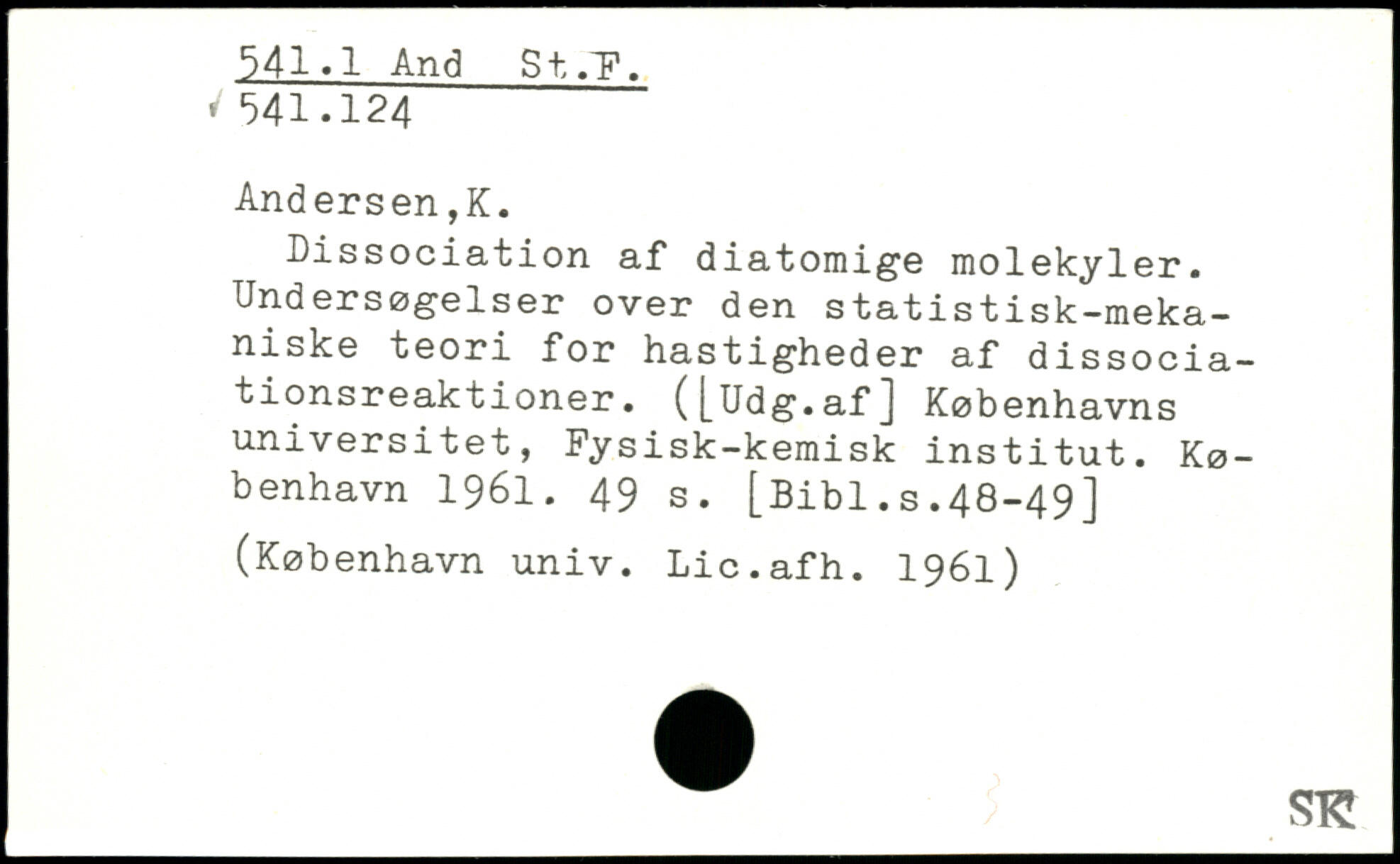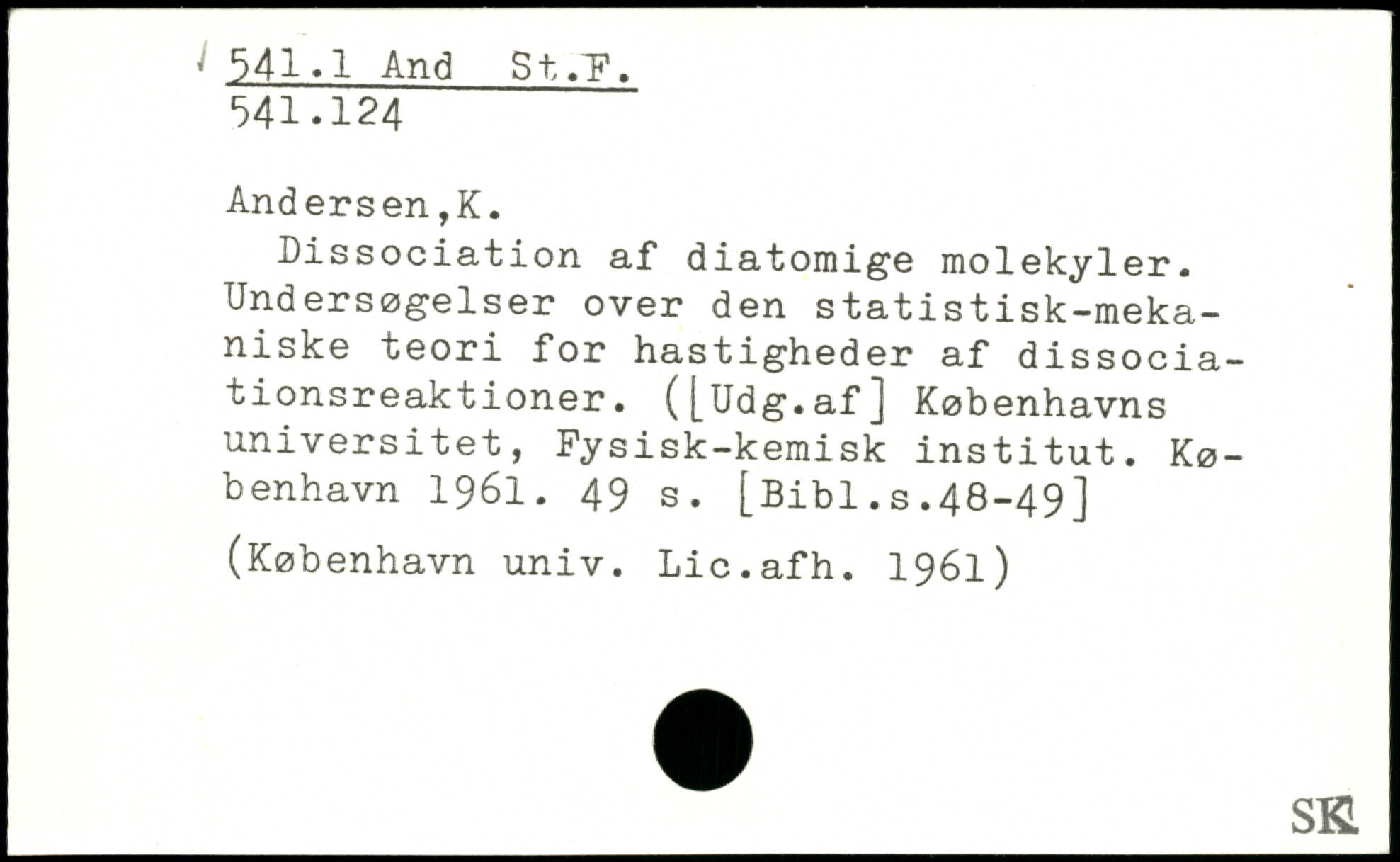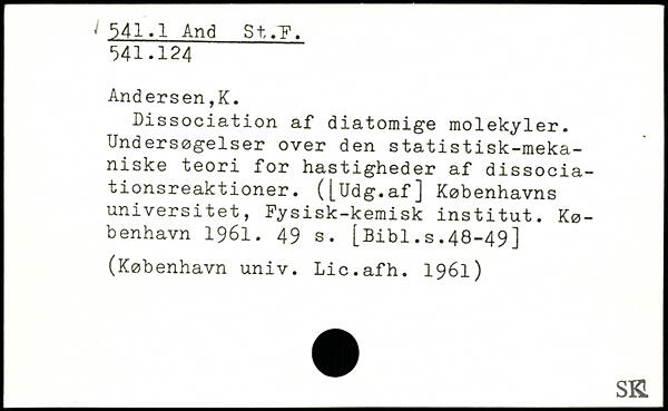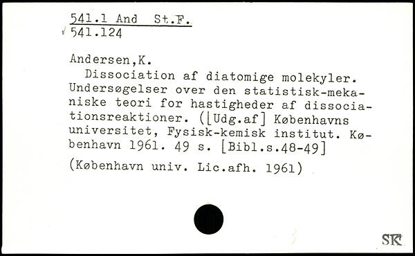 Dissociation af diatomige molekyler. Undersøgelser over den statistisk-meka-niske teori for hastigheder af dissociationsreaktioner. ([Udg.af] Københavns universitet, Fysisk-kemisk institut.