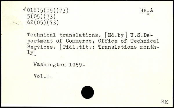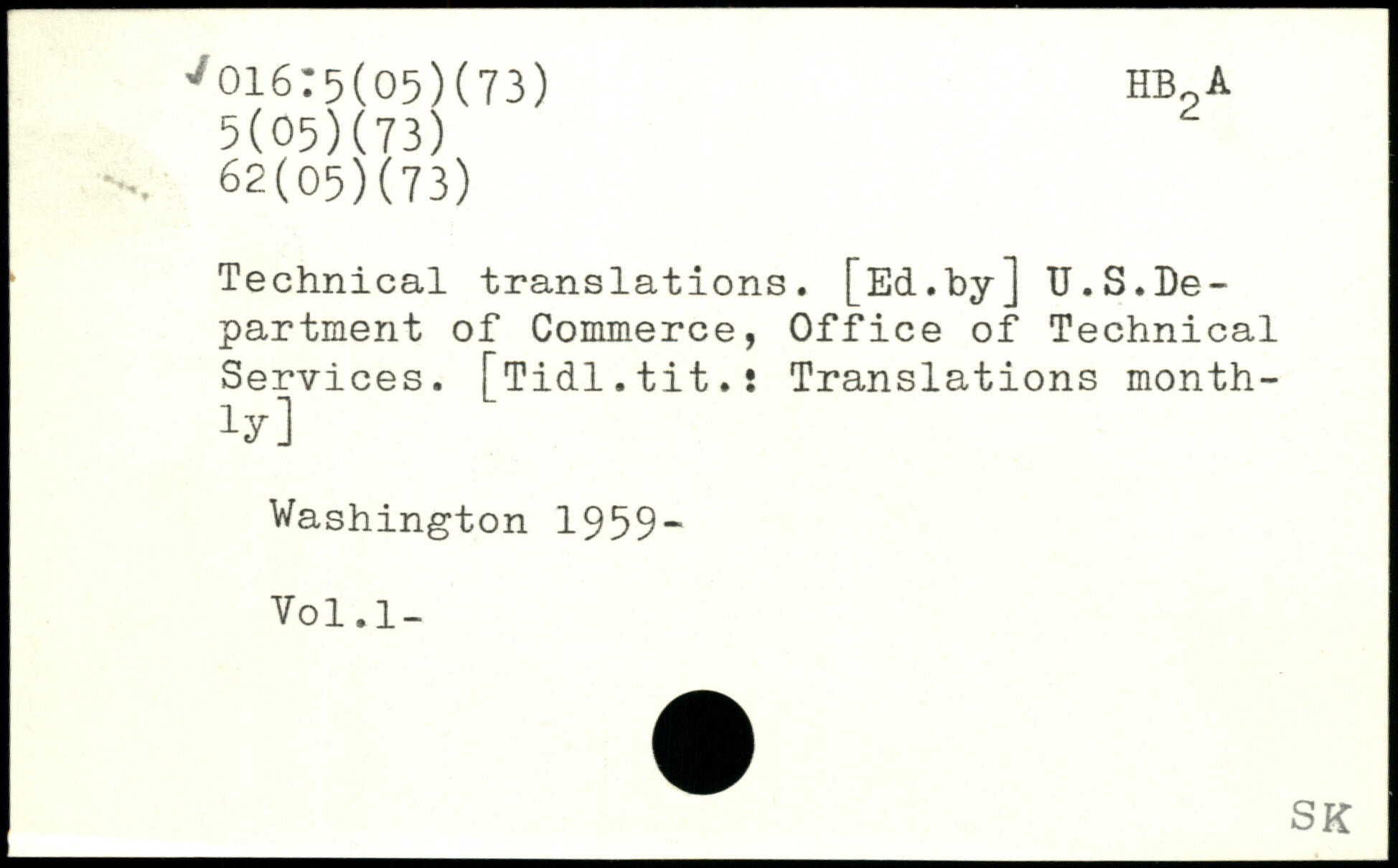 Technical translations. [Ed.by] TJ.S.Department of Commerce, Office of Technical Services. [Tidl.tit.ï Translations month- iy]