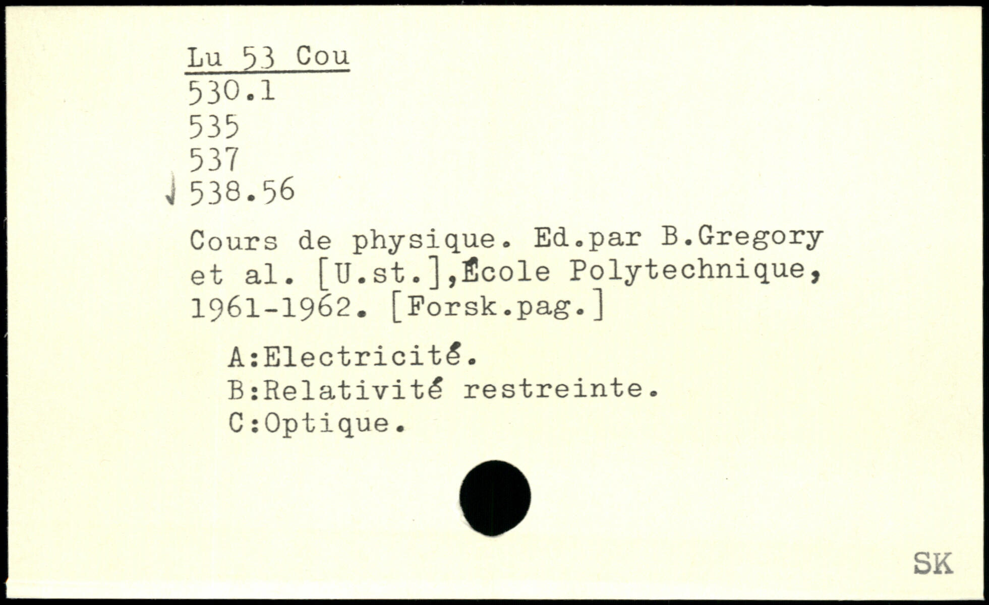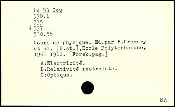 Cours de physique. Ed.par B.Gregory et al. [U.st.],École Polytechnique, 1961-1962. [Forsk.pag.] A:Electricité. B:Relativité restreinte. C: Optique.