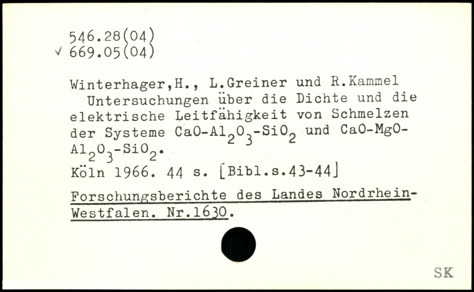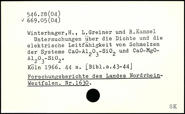 Winterhager,H., L.Greiner und R.Kammel Untersuchungen über die Dichte und die elektrische Leitfähigkeit von Schmelzen der Systeme Ca0-A1203“Si02 und CaO-MgO-A1203-Si02. 5