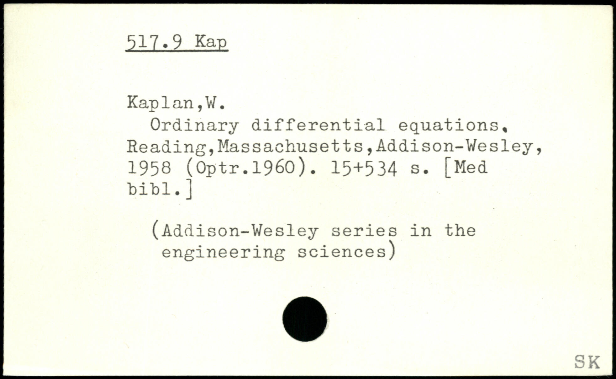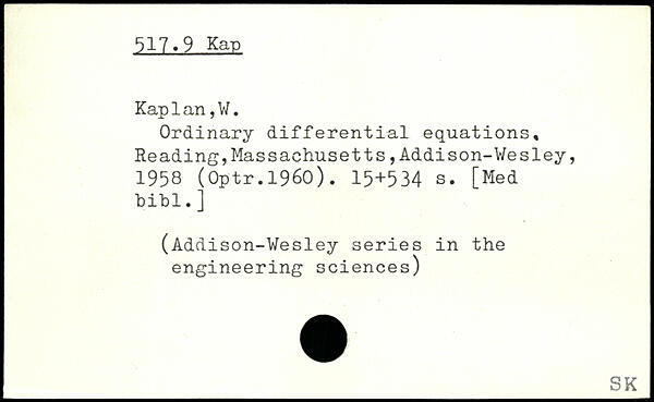 Ordinary differential equations, Reading,Massachusetts,Addison-Wesley, 1958 (Optr.1960). 15+534 s. [Med bibl.]